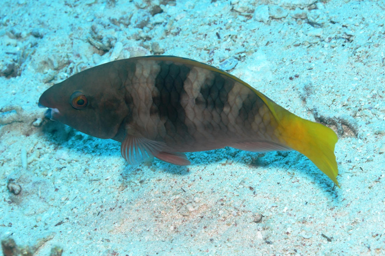 Parrotfish. Red Sea and Gulf of Aden endemic. To 41 cm. An initial phase individual off of