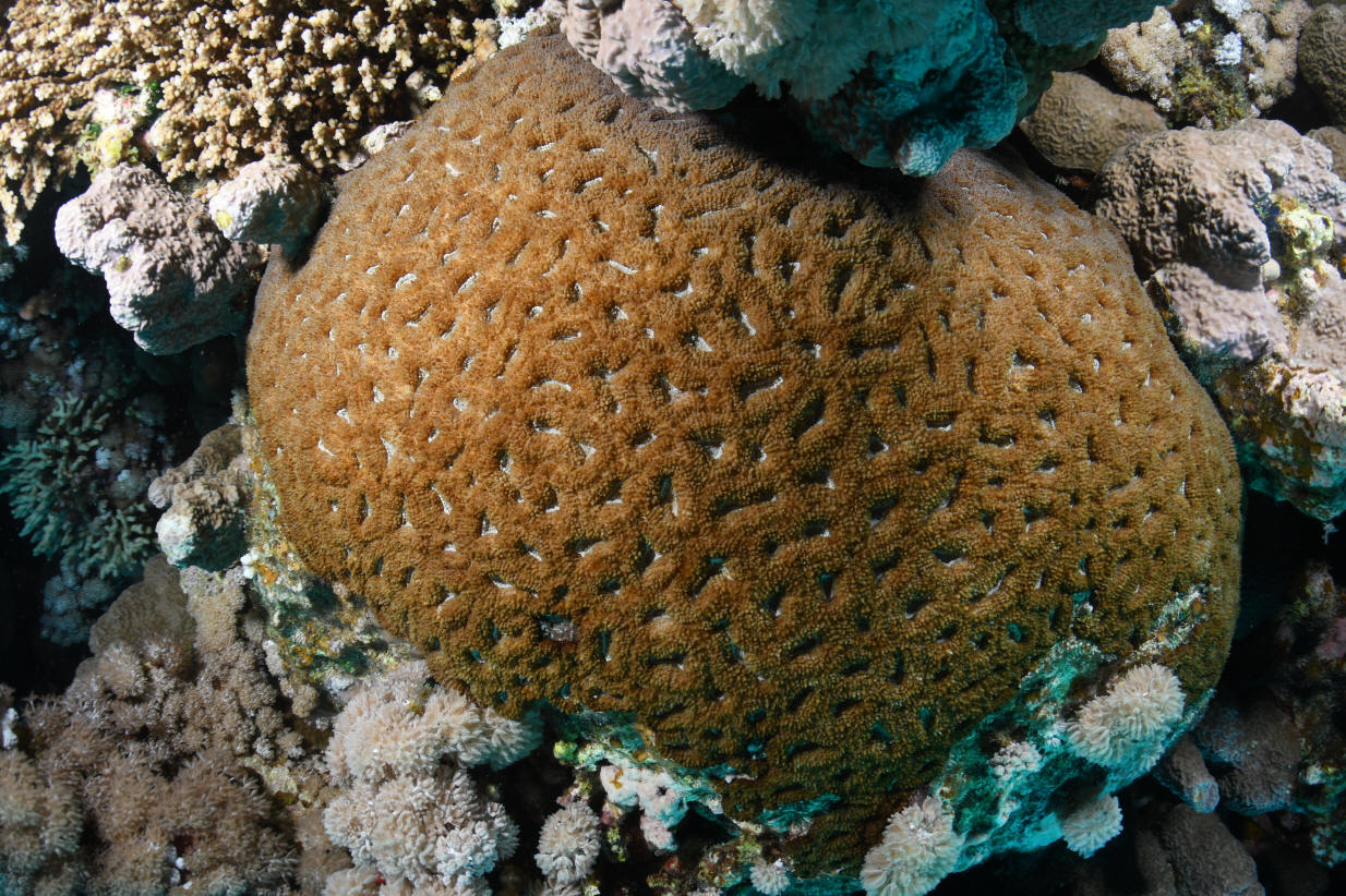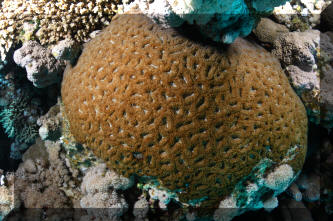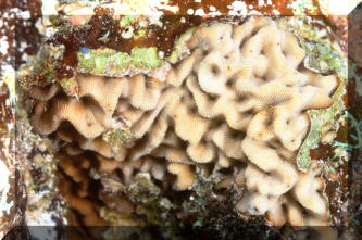 submassive. Corallites immersed, hooded or spiny. Colored light brown to