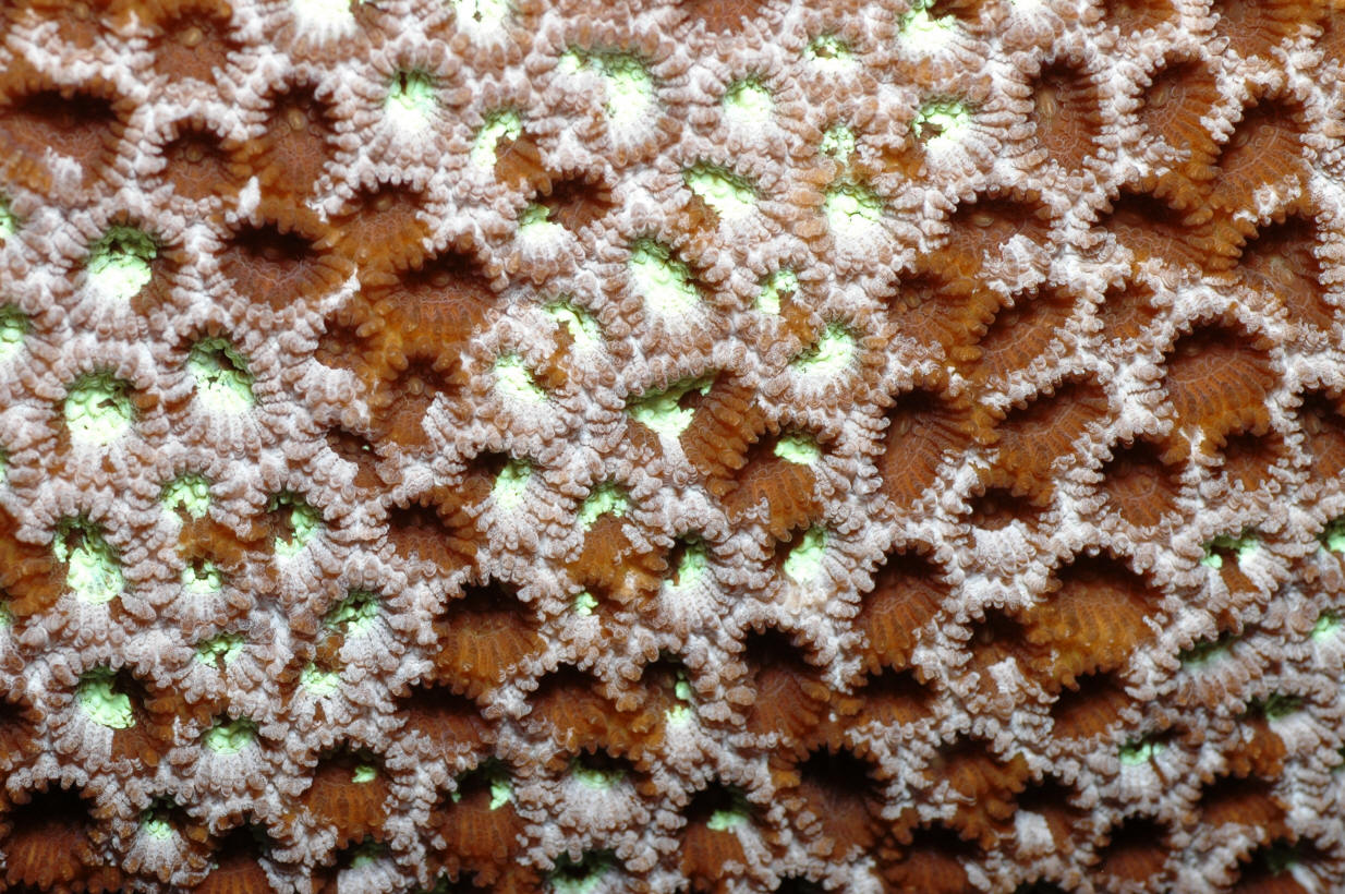 of irregular massive shapes. Corallites 11-13 mm in diameter. Yellow-tan to