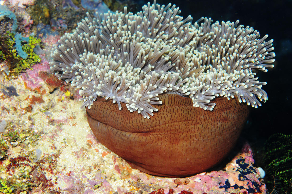 Anemone. Family Stichodactylidae. Found in open areas, attached to a solid