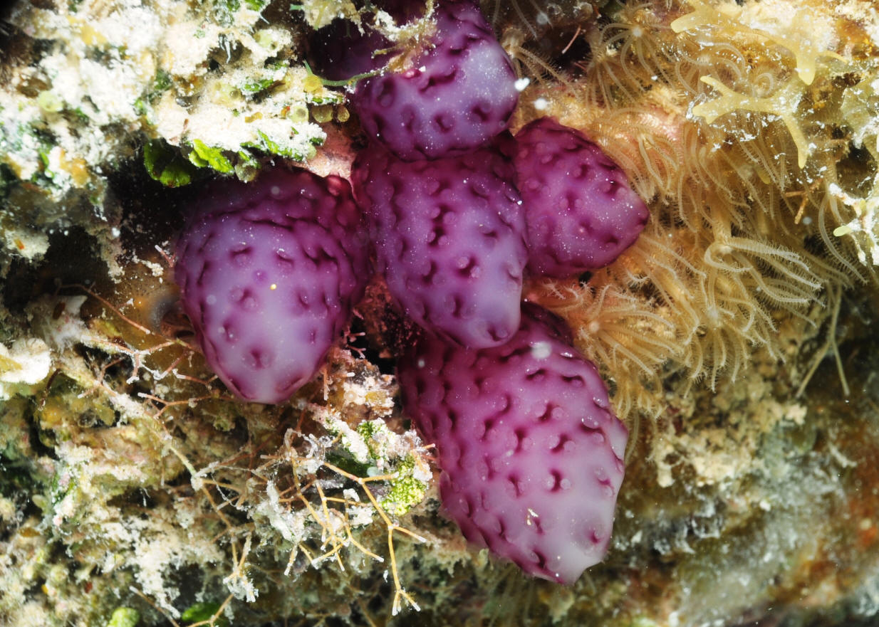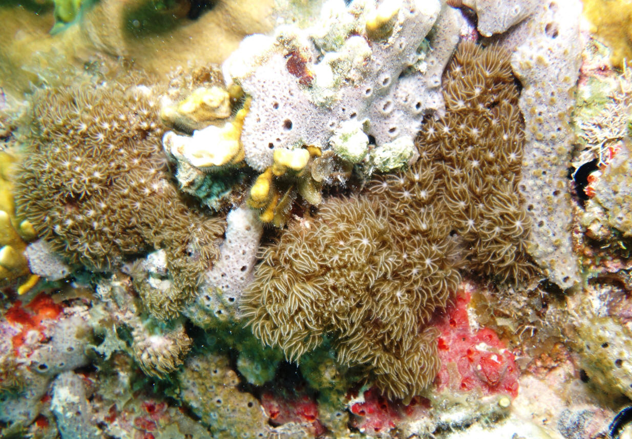 Gorgonian. Form encrusting mats that look hairy when polyps are