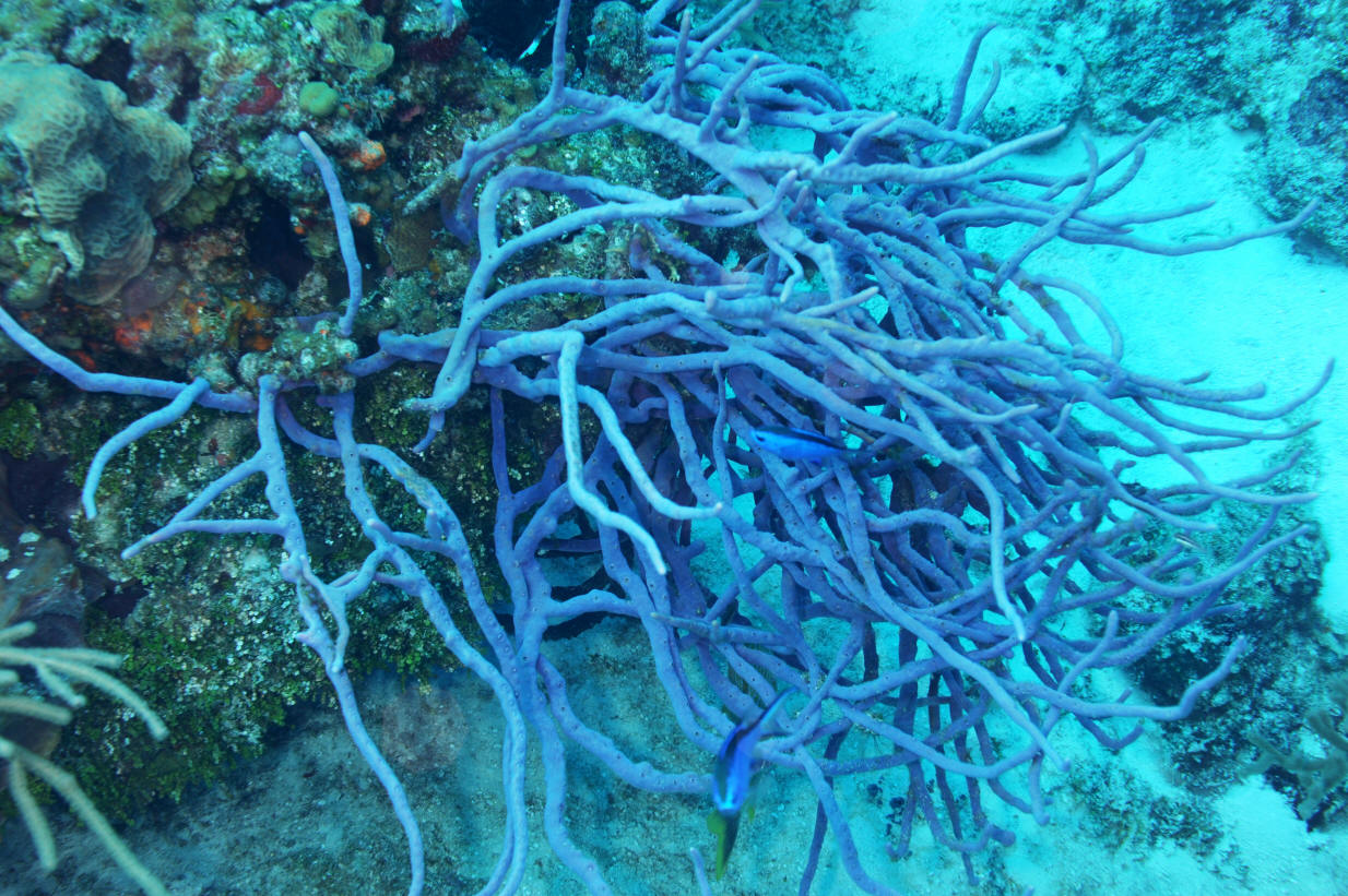 Aplysina cauliformis, the Row Pore Rope Sponge. Long rows of excurrent siphons. Occur in tints of purple, reds. Cozumel 2014