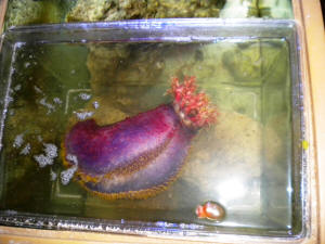 Indonesian Sea Apple 8/15/07 Hey guys, love the website and the information you so kindly provide. With that said, I work at my LFS and have been working in aquaria for about 4 years. I purchased an Indonesian Sea Apple for my 30-gallon community tank, <... Yikes...> knowing (or at least thinking I did) the inherent risks of the organism. I have had the Cuke for more than 4 months and he receives daily doses of Marine Snow <Of almost no nutritive value> and has appeared to be doing well (no inflating from stress, no loss of size, no moving in the tank once established). Today however I came home and noticed that one of my favorite fish had passed, one of the ones I had had in the tank for a while (5-6 months). I peered into the tank and noticed what appeared to be little green balls (about the size of a flea perhaps?) floating all around in the water. I examined the Cuke closely and it appeared to have strings of these little balls wrapped around a few of its feeding feathers. Another reader had written you about a similar experience ("little yellow balls" in his case) and I was wondering if this is in fact the Cuke reproducing? <Possibly this... or fecal material... or?> I couldn't find any info on how they reproduce. Is it common for them to reproduce in captivity? <Not uncommon> Also, if so are the eggs simply themselves toxic? <Can be, yes> I have never done a full change on my tank and unless I notice labored breathing or anything of the like I don't intend to, at least until I establish that this did in fact come from the Sea Apple. <Good point... this material could be unrelated to the Holothuroid> Aside from him the only other inverts in the tank are a pair of Skunkback Cleaner Shrimp and Peppermint Shrimp, <Could be their eggs... though unusual to be released as such> Margarita Snails, Blue-legged hermit crabs and a small Tiger-Tail Cuke and of course the corals (mostly Euphyllia, Toadstools, Zoos and Mushrooms). Thank you for any insight into this odd situation! Alec Parodi Valencia, CA <Do keep a close watch on this system... "If" something goes sideways with the Sea Apple... all could turn into bouillabaisse in minutes... Bob Fenner> Re: Indonesian Sea Apple 8/15/07 PS - Somehow missed the section on your site with the information about the sea cucumber reproduction. I now see that this is exactly what happened. Despite my cautions with it dying being a problem, I never thought that it THRIVING (i.e. reproducing) would be a problem. In the last 2 months though I have had my rose bubble anemone split once and my toadstool leather reproduce through self-fragmentation a total of 12 times. Guess I am taking TOO good of care of my tank. Alec Parodi Valencia CA <Heee! Possibly. BobF> Re: Indonesian Sea Apple 8/15/07 Thank you very much for the reply and information Mr. Fenner! Wanted to update you as to the situation - I checked the water chemistry and the only thing that was off was the nitrates (around 15, ppm I suppose?) which is a tad unusual considering that with the amount of bacteria in the system the tank has never gone above 5-10. So after I noticed labored breathing from the fish I did a 60% change. <Good move> Several hours later I had lost 1/2 of the total fish in the incident, <... sorry to realize> including the original fish that played the role of the canary in the mineshaft apparently. Shrimp seem to be fine, as do a couple of the surviving fish, although the cardinal looks like he is on his last leg. <IF at all possible, DO MOVE the remaining livestock... fish and non-fish to an entirely different setting/system!> I removed the Cuke from the tank and haven't seen anymore of these "little green balls" since. The water chemistry after letting it sit overnight was perfect. Is there a risk leaving the eggs which inevitably fell into some of the live rock, etc? <Not much> Or would it be like any other organic matter and simply raise the ammonia or nitrate? <Perhaps just the dying fishes> I just want to make sure that as they dissolve they will not toxify the water. One last question (I promise!) was what commonly available food do you recommend as an overall feed for inverts in a tank (corals, dusters, apples, etc). <Do general my friend... possibly just a large, healthy refugium tied in... with live organisms being produced, exported from there> I know that is a question which is a bit silly considering that all of the above feed on different particles of different nanometers, but thought I would ask anyhow. The info I have read on the apples indicate their feeding apparatus can only capture particles ~<50 nanometers. Thanks again! Alec Parodi Valencia, CA <Keep studying, applying yourself my young friend... Consider writing your experiences, fields you are interested in... into articles for sale. Bob Fenner> Re: Indonesian Sea Apple 8/15/07 Thank you very much kind sir, have spent most of this morning on the site (which BTW I was excited to see referenced as a, well, reference in the last issue of Tropical Fish Hobbyist Magazine)! Alec Parodi <Ahh! Thank you Alec. Bob Fenner> Sea Apple = A-Bomb 03/25/07 I am completely heartbroken and devastated. All the fish in my main saltwater tank (135 gallons) were just killed by a Sea Apple that eviscerated while I was at work except for three fish. <Unfortunate, but all too common. I am sorry for you loss.> Only two paired Ocellaris Clowns and one Blue Green Chromis survived. Fifteen others sadly died, including four cleaner shrimp. Apparently this happened when my local electric company temporarily terminated electricity and my equipment turned off. I came home to find the devastation, dead fish everywhere and the worm-like insides of the Sea Apple were all over the tank. <Such is the risk of keeping Holothuroids in a populated tank. Evisceration is really more of an eventuality than a risk. It most likely WILL happen and at an inopportune moment.> By the way, there were all kinds of unidentified creatures in the tank that I 
