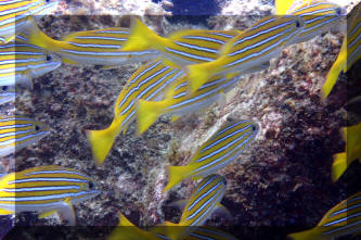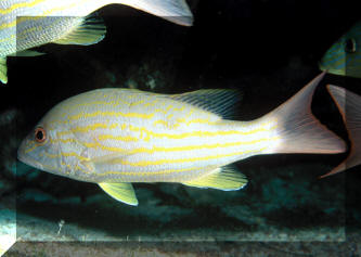 Selection: General to Specific A good snapper is easy to find; most offered are excellent, and the one's who "aren't going to make it" are pretty obvious. The latter share two common observable traits: they're physically and behaviorally beat. Broken fin spines, swollen eyes, missing scales and open cuts are evidence of improper capture and handling. Excessive cowering and lack of feeding come from pretty much the same. Leave such specimens to recover at the dealers. Collecting Your Own I want to mention as another item to look for when making a purchase. Snappers are gathered by hand to hand netting, driving into a barrier/mist net, and hook and line. The last category are generally okay in terms of quick healing... but sometimes not. Check for a hook mark in the mouth, even for little fish, and make sure the specimen is eating before taking it home. Environmental: Conditions Habitat Snappers are undemanding for the most part except for two requirements; adequate living and hiding space. The first is plain to understand; but you'd think that such "reef-bullies" wouldn't be given to sulking and hiding in the dark; but they are. To keep yours happy, construct a good sized cave of rock, coral, shell, what have you; and leave it alone. Chemical/Physical Conventional "fish-only" conditions of specific gravity, temperature range and stability, and lack of nutrient build-up suffice. Filtration And circulation should be vigorous to remove wastes and expedite gaseous exchange. A decent skimmer (one that doesn't remove foam continuously) is mandatory for good health. Behavior: Territoriality/Predator/Prey Relations: Though some snappers are social animals, feeding and traveling in schools, most are best maintained one to a tank in captivity. They get along fine with other species that are too large to be ingested. Snappers are definitely not reef tank additions, getting too big and eating smaller fishes and critters. Introduction/Acclimation After quarantine, or at least a freshwater dip-bath, snappers may be unceremoniously transferred via a soft net or covered container into the main/display unit. Be aware that they will hide for a period of days to a few weeks, possibly without feeding much or at all. This "scared-dog" conduct is normal for snappers and may be shortened by attention to decor and feeding. Feeding/Foods/Nutrition: Types, Frequency, Amount, Wastes A snapper that does not accept food is rare; a periodic food strike shouldn't worry you however, and all will accept meaty items after acclimation. In the wild snappers feed on small fishes and non-vertebrates; in aquariums they readily adapt to frozen squid, crustaceans, Lancetfish, shellfish... Disease: Infectious, Parasitic, Nutritional, Genetic, Social Snappers are typically clean on arrival, and amongst the last fishes in a system to catch and succumb to usual environmental, parasitic and infectious diseases. They respond well to basic remedies (copper, dips, specific gravity manipulation) for crypt and velvet. Close What more could you ask for in the way of a show specimen for your marine set-up? The only real negative aspect of keeping snappers is their growth and size; both of which you can control by feeding sized portions one to three times a week. You might not see them often at your dealers, due to lack of folks asking for them, but the snappers (except for Macolor) make great fish-only system specimens; if you have the space. Bibliography/Further Reading: Allen, Gerald R., 1985. FAO species catalogue. Vol. 6. Snappers of the World. An annotated and illustrated catalogue of Lutjanid species known to date. FAO Fish Synop. (125) Vol. 6 Burgess, Warren E., Herbert R. Axelrod & Raymond E. Hunziker III, 1990. Atlas of Aquarium Fishes, v.1, Marine. T.F.H. Publications, NJ. Fenner, Robert. 1997. Put a tiger in your tank. Keeping Snappers. TFH 2/97. Nelson, Joseph S., 19934. Fishes of the World, 3rd ed.. Wiley, NY. Randall, John E., 1968. Caribbean Reef Fishes. T.F.H. Publications, NJ. Tinker, Spencer W. 1978. Fishes of Hawaii. Hawaiian Service. |