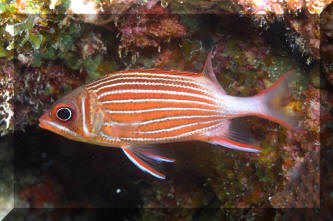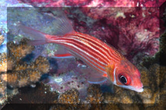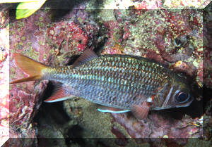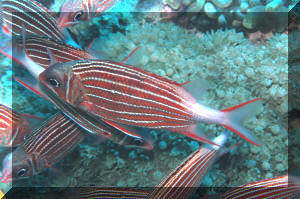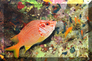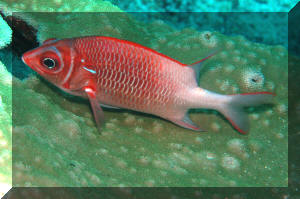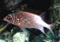 Selecting Healthy Specimens In terms of picking out a healthy specimen, be wary of any squirrelfish in a group with others that display: 1) reddening in patches, especially around fins and under the body. This is often a sign of rough handling and bacterial (Aeromonas, Vibrio) infection; usually fatal. 2) Torn fins, cheekspines, scales, see 1), and/or 3) evidence of external parasite/removal damage. Collecting Your Own Compared to other marines is a breeze. Squirrelfishes are easily spooked out of hiding into a carefully placed barrier or mist net and hand netted from there. Care must be taken to not damage the catch by tangling and pulling on it in the netting; or the captor by getting poked but good by the squirrelfish's spines and sharp scales. compared to other marines is a breeze. Squirrelfishes are easily spooked out of hiding into a carefully placed barrier or mist net and hand netted from there. Care must be taken to not damage the catch by tangling and pulling on it in the netting; or the captor by getting poked but good by the squirrelfish's spines and sharp scales. Environmental: Conditions Habitat Can you replicate the hiding netherworld of ledges and coves by day, the bottom, food searching, nocturnal swimming space by night? Chemical/Physical Not demanding; lower temperatures are preferred, 72-78 degrees F.. Higher temperatures may bring on a feeding strike and odd behavior. Higher, steady specific gravity are appreciated, closer to 1.025; maybe due to their close association with invertebrates? Biology/Other I'd like to mention that holocentrids produce audible sound, above and below water. They grind their pharyngeal teeth and stretch muscles against their long gas bladders; much like rubbing your fingers along a balloon. I Filtration I'd shy on making it brisk. These fishes are found in areas where the water really whips at times. Display For a really outstanding arrangement, provide a large dark cave-space with two openings and a group of these fishes and others they are found with in the wild. The under ledge and cover sub-habitat is a rich biotope in the reef world. Behavior: Territoriality Generally not. Squirrelfishes live comfortably alone as adults. In the wild most live in aggregations as young. Introduction/Acclimation Best put in established systems, keeping light on but subdued for a couple of days. Predator/Prey Relations Most Squirrelfishes as individuals get along with their own kind, other species of Squirrelfishes and other tankmates. Most would-be predators give them wide berth after looking over their overall spininess. Think twice size-wise about using squirrels as reef-tank organisms. They are supreme choices as being hardy and interesting, but will greedily swallow any and all crustaceans that can fit into their expansive mouths. If you lack and do not intend to have shrimp(s) or crab(s), and would like to minimize bristle and other worm activity, consider a squirrelfish. Reproduction, Sexual Differentiation/Growing Your Own: See citations below for chance spawning reports of the related family of monocentrids. Squirrelfishes are indistinguishable externally as male, female. Feeding/Foods/Nutrition: Types, Frequency, Amount, Wastes They are predators on small very small fishes and mobile invertebrates, principally crustaceans in the wild. Livebearers, shrimp and other fresh and frozen meaty foods are acceptable; avoid pellets, flake and other dry prepared foods; these will not sustain them. If your specimens are new, refusing food, or go on a feeding strike, execute a large water change and try a live shrimp with the lights off on the system. Generally Squirrelfishes can be trained to take 'wiggled' krill or other shrimp. Disease: Infectious, Parasitic, Nutritional, Genetic, Social These fishes are generally received free of external parasites, and clean up easily with routine freshwater dips and quarantine. The usual protozoan scourges of tropical marine fishes can be handily defeated if detected early enough with standard copper remedies. Summary: To Spanish-speaking countries they're saldados or matajuelo; to the French: malais, in Hawaii: alaihi. To you and I they are the aptly named Squirrelfishes and Soldierfishes, the Holocentridae. Good aquaria specimens, whose only demands are meaty foods and a place to hide. Bibliography/Further Reading: Burgess, Warren E., 1975. Salts from the seven seas (about Pineconefishes). TFH 6/75. Chlupaty, Peter, 1982. Keeping Australian pinecone fish. TFH 4/82. DeGiorgis, Joseph A. 1987. The longspine squirrelfish, Holocentrus rufus, FAMA 2/87. Hemdal, Jay, 1986. The Flashlight Fish, FAMA 11/86. Howe, Jeffrey C. 1994. Original descriptions, Sargocentron marisrubri Randall et al. 1989, Beryciformes, Holocentridae, FAMA 6/94. Nelson, Joseph S. Fishes of the World, 3rd Ed., 1994. Wiley & Sons. |