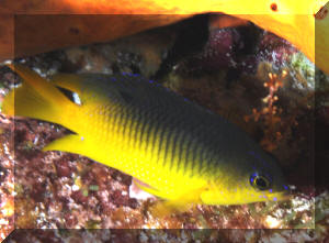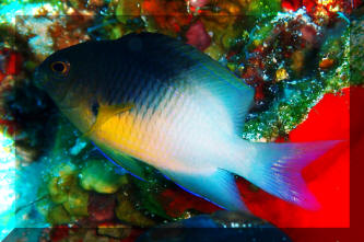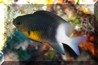 Damselfish. Tropical west Atlantic. Front of body dark above, yellow below;