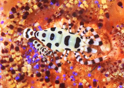 colorful and clear bodied shrimps that live epizootically on Echinoderms
