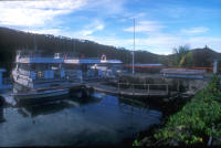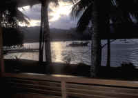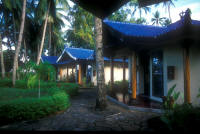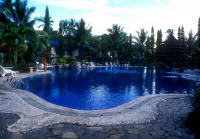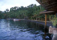 Located a few miles west of Manado town, necessitating about an hours pleasant cruise to Bunaken itself (though shorter to the three house reefs and other western shore dive sites), Tasik Ria Resort is a "middle" comfort resort dive destination, with nice grounds, a pool and spa, good food and good dive service provided by Eco Divers (of the same name in nine locations, eleven boats in the Red Sea)... who currently (2005, 06) managed dive operations in KBR as well. A view across the pool, out on the dock and seaside bar and alternate grill, and a view of some of the single bungalows (there are multiple units as well). |