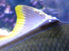 12/04/09 Sick Trigger (Xanthichthys auromarginatus) 01/17/07 Greetings, <<Hello!>> First, I want to thank you for the work your doing helping us make insightful decisions. <<Most welcome...truly a pleasure to share>> I have a Blue Jaw Trigger, Xanthichthys auromarginatus, <<Me too!>> that has not been well for two weeks; it is very immobile, propping himself up on or over something continually. <<Hmm, it's not unusual for this fish to occasionally stop roaming/peer out at the world from its favorite cave...but it shouldn't be lying around all the time>> He has been eating, but only when fed directly and does not seek food. <<Mmm, should be active/interested at feeding time>> A couple of days ago he began spitting back out the large plankton, so I made a batch of food in the blender of: shrimp, oyster, clam, Selco, formula II, and daphnia; it is eating, but again only when basting directly toward his mouth. The fishs colour is about a six out of ten; there is yellow outlining the tips of the fins with a dark band on the body at the fin's base. <<The yellow margin on the fins is naturally occurring on a male X. auromarginatus...but the dark band is possibly a sign if distress>> Its distinctive dots and blue jaw are still clear. <<Good>> I QTd the fish. He was housed with a Sebae and its GSM since May (8 months). The tank is too small; it is a 70-gal bow front and has four feet in front and back of the rockwork to swim with two or three nice caves underneath in which he'd sleep. Many sites put the limits for this fish at 75 gal, and I knew Bob recommends at least 100 gal. <<Yes...or larger>> Occasionally needing to keep the money maker happy I ordered the fish. There are no signs of trauma, or tumor. Are these symptoms of small tank syndrome or something recognizable/treatable? <<If the fish has not suffered some physical trauma, then this sounds to me like an internal protozoan infection (lethargy is a telling symptom here). These are difficult to treat, and often by the time the symptoms manifest it is too late. The fact the fish is still eating is a good sign and I suggest you try some foods post-haste made for treating internal parasites (New Life Spectrum has such a food).>> My wife is a veterinarian having many medications/antibiotics available. <<Then perhaps try soaking some thawed frozen food (mysis shrimp, chopped krill) with Metronidazole. See here for information on dosages, cautions, etc. : http://www.wetwebmedia.com/metranidazole.htm >> Lastly, I've read to moderate length about hyposalinity, and while probably not a cure, will reducing salinity ease fishes metabolic demands? <<Though it can be of use in some situations (dips/baths), I am not a fan of long-term hyposalinity for the stress it places upon the fishes. They have evolved to live within certain saline parameters, changing those parameters requires them to make adjustments/work harder to maintain their osmotic balance >> I maintain a salinity of 35ppt. <<Excellent...do keep it there>> Thank you, Robert <<Good luck Robert...and please let me know how the treatment goes. Eric Russell>>