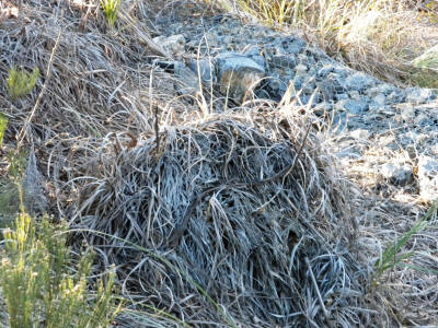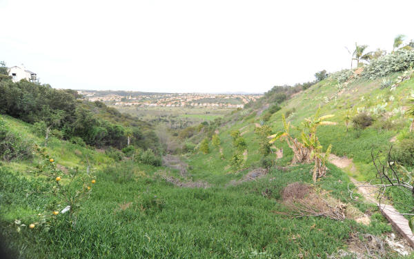 Filled gulley area, proximally near storm drain discharge, draining downhill left and distally
