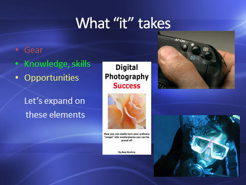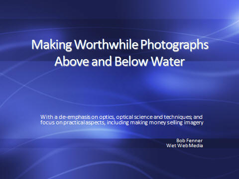 ![]() Other talks/presentations have sufficiently gone over theoretical and practical aspects of taking photos underwater and above. This pitch targets the current best practices briefly on gear and fields of making, and successfully marketing image work in our interests. ![]() Images serve all sorts of purposes: "A pic is worth oh so many words" as the saying goes. For folks trying to sell their writing, there is nothing better than having good photos to go along with it. My fave example is the song writing duo of Elton John and Bernie Taupin... with the former writing melodies and Bernie cranking out the lyrics. Both good/great in their own fields and tremendous together. Humans are visually oriented. If we were dogs we might have Playdog magazine, with blank pages w/ smells smeared on them. Also at a basal level, we are hunters, gatherers... and imagery plays a strong role in our sharing, engaging in these activities and their recountings. ![]() The requisite elements of making photographs are listed. Read them: Equipment, the mental and physical ability to use it, and the settings to put the gear and knowledge/skills to work. ![]() Most important, and thus listed first, is light/lighting. One/fave definition of what photography is is controlling light. You have to have sufficient quantity, quality of light to make photos... ambient and/or provided artificially. Almost always you'll want to provide at least "fill". Some folks still shoot film... and most then digitize for use... I only shoot digital now. The last point is worth mentioning again. ![]() Go with what you know... and if you don't know much, go w/ something simple to start with. Many, too many folks get overwhelmed, discouraged to the point of giving up by having too sophisticated gear to begin with. Start with a basic model if you have no in/formal background in photography. Like a good scientist, change only one setting at a time, and go back, change the setting till you understand the practical implications/actions of its use. I have judged at underwater film contests where the ten dollar camera shot won the "grand prize"... With, at times, the multi-thousand dollar rig folks howling re. What the winner knew in the way of where to look, the local biology, how to "tell a story" with the setting... trumps any/all gear cost. Having the most expensive set-up does not equate w/ |