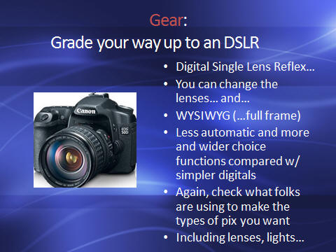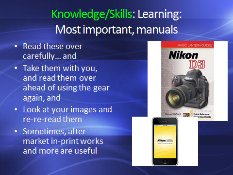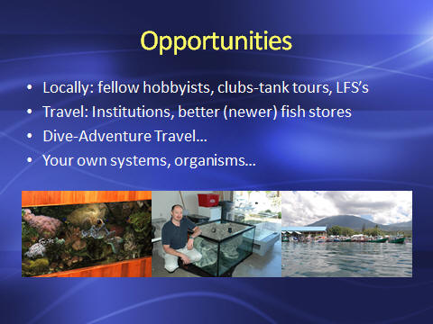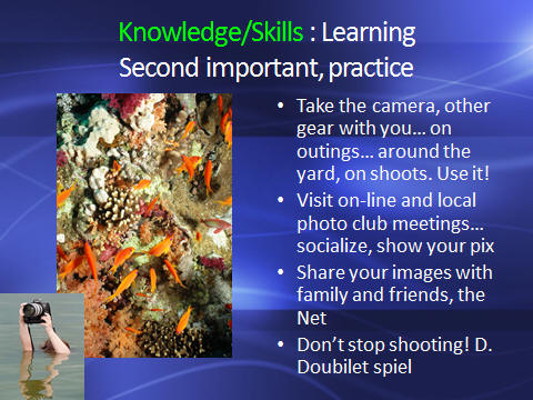 ![]() Many people "jump right in" and start using their photo et al. gear w/o reading the accompanying manuals, other inserts. This is a giant mis-step IMO. Do carefully read over all media that come with your gear, going over the features, buttons, what have you. I take these materials w/ me on all photo trips, and have never failed to learn something new and valuable by their perusal. Look at reviews on the Net (Amazon et al.) re after-market "how to" books, DVDs on using your gear and post production software. Some are very worthwhile. Additionally, do show/share your image work w/ other photographers, casually and at actual get-togethers for such sharing. There is no better way to learn than have other interested, similarly-engaged folks critique and enjoy your images. \ ![]() If/when you become "more serious" about image-making, do save up and purchase a digital single lens reflex camera (as opposed to a compact digital camera. There's more advantage than simply being able to change lenses here. Many new models have live views that are full frame (as opposed to cropped). Makes/models come and go, and it is impossible to give "advice" re what might work best for you. If you have lenses from a given manufacturer, it may be better for you to go with one of their DSLRs; otherwise adaptor rings exist to fit cross-models, and there are makers of other-branded lenses et al. that are almost as good and often significantly cheaper... The best input I can proffer is to go on-line, chat with folks who are trying to make the sorts of images you have in mind... READ what they're using, and why they do so. ![]() Putting your knowledge into actual practice comes next. There is nothing like thorough familiarity with ones gear to grant optimized results. Hence, you're encouraged to get out, use the camera and related equipment as much as practical. David Doubilet once was asked how someone might improve my photo work. He asked, "How much film are you shooting?". I said, about a case a week. He said, "Oh, good". I said, wait a minute, what do you mean by a "case?"... To me this was a "brick" of twenty rolls... To him, it was a gross, 144 rolls! ![]() Yes, there are courses of instruction in many aspects, some gear-specific in this field. Some can be found on the Net, a few are offered by manufacturers themselves, others are part of the academic experience. Don't be shy about showing up at local photo clubs, or joining/browsing the online ones. Image work is really all about sharing, and the best personal input you will find is through these associations. ![]() Photo opportunities abound! Particularly for folks that "get about". Many aquarium clubs have regular "tank tours" going about to member's et al's systems. Public aquariums can also be useful for photo op.s, but do check w/ them re their photo policies. Some deny the use of flash (so you'll have to use higher ISO settings, longer exposures...). Consider coming out and visiting aquatic life where it occurs naturally. Lastly, how about your own systems and organisms? |
