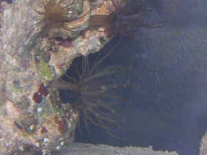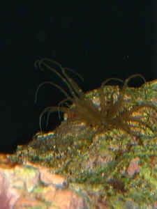Anemone ID 1/26/04 I am starting up a mini-reef system (my 1st marine system) and am in the cycling phase (got 2 clowns and a damsel for 4 days and still 0 ammonia). <Hi Ray! Congrats on entering the Marine Hobby!> I have about 50# of live rock and a small anemone came out of one of the cured rocks that I got from the local pet shop. I went back to the shop and they did not have anything that even resembled this creature. I am wondering if you could help me ID it and let me know if it is something that is worth keeping. <Your critter is Aiptasia. They can be very serious pests. I would strongly advise killing or removing it. A thick slurry of Kalkwasser applied with a syringe is very effective (don't get it on your skin!)> It is only about 3/4" tall. It has a clear base and brown arms. For several days it was attached to the surface of a rock but overnight it moved a few inches and now is in a small hole in the rock and comes out during the day but is quick to withdraw into the hole if disturbed. After the first week, it started looking a little sick so I fed it a small piece of fish and it pulled it in and has since grown a little and produced a second row of arms. Attached is a pic of it. The resolution is not great but you can see it pretty well. <Yup. Aiptasia.> Also, a few of the live rocks that I got were bright red when I got them but are now a deep brown color. Is this normal or did something happen to them? The rock that the anemone in question is on is one of the red rocks that changed. <This is typical algae succession. Adding a couple of snails should help control this, as will water changes and skimming.> Thanks for putting up a great site and I have learned tons of info from it. I look forward to hearing from you. -Ray <Glad you enjoy WWM! Happy Reefing! Adam> IS It Aiptasia? Hi again, this is just a follow up on my original email about the pest anemone/Aiptasia email I wrote to you last night. Upon further research, I think I've figured out what the smaller things were that I originally thought were Aiptasia, not that this is any better I think. They look identical to the one picture I found on the web...Pileolaria Sp. which showed the small white markings that I have in my tank (I attached a picture file #22 which shows the small white specs on the back wall of my tank and also the large tube like bodies growing all over my mushroom rock. The feathery things are growing out of the end of the curly white tubes)...do you think by looking at my pic that it is Pileolaria sp. I would guess that it is except that it didn't really say that the "white specs" grow into tube like featherduster, which is what a lot of mine have grown into. If that is what they are, are they a "pest" type featherduster? <Unfortunately, I was not able to open your attachment. If, however, these animals are what you think they are, I would not be overly alarmed. My biggest concern with things that grow in or on or near corals is "Do they have the potential to sting or otherwise smother my corals?" If these things can be controlled by "pruning" or isolating them, all the better, IMO> They seem to be spreading everywhere...now I am noticing the specs of white on a lot of my rock, back and side walls of tank and also the tubes are in the sand as well as on the rocks. They seem to be bothering my mushrooms also, the mushrooms that have the "featherdusters" growing near them have not opened up fully. If they are a pest in my tank, how would u suggest getting rid of them? Like I said, I did a complete web search, google search and WWM search and didn't pull anything up on Pileolaria sp (except the one article which shows the picture). <Well, a number of wrasses, such as the Halichoeres species, do include some polychaete worms, so you may want to give one a try. Some people use Arrow Crabs to do the same thing. As with all "biological" controls, the possibility exists that your "helper" may munch on some desirable tubeworms as well, or may ignore them altogether. Sometimes, good old manual extraction is the best way to control problem animals.> Also attached is 2 other pics of the large tentacle thing that I am really not sure what it is except I'm leaning towards a pest anemone. I saw an identical picture on your web site, but it was just at the top of the pest anemone page, it didn't say exactly what it was, or at least I didn't see its name. Can u identify it by the 2 pictures I sent? This I'm getting worried about as well. Its pretty large, tentacles are about 1.5" or longer maybe. Like I said, it feeds on pieces of mysis(d?) shrimp and brine. It was housed within the polyps fine when I bought it (I thought it was part of it actually) The polyp mass has consistently tumbled off the rock where I originally put it, now the tentacle thing has stayed behind. You can actually see the coral polyps behind the rock on the sand bed in the pictures. I'm thinking it is trying to get away from it, maybe its all of a sudden stinging it or something? <If it is an Aiptasia, you can certainly use a variety of techniques to eliminate it, which are discussed throughout the site. It sounds like something that you'd at least want to isolate!> Anyway, I hope the pictures help with identification. I'd really like to know what these 2 things are and if they are bad/pests and if I should get rid of them (well, the large thing I can just take the small piece of rock its made a home in out of the tank... <Good idea> The other "featherdusters" I'm not so sure of. <Again, the aforementioned "biological" controls may be best.> Thanks once again for all the help you so willing offer. Have a great day Jan <Glad to be here, Jan. Sorry that I couldn't be more specific. I think that you are reacting correctly, though. When in doubt- take 'em out! That's my thinking...Good luck! Regards, Scott F> Ackk! Is It Aiptasia? Hi Crew.... Haven't asked any questions in a few months so I thought I could sneak one to ya... <Ask away- Scott F. here t