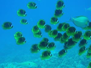 angel, maroon clown pair, yellow tailed damsel and another yellow