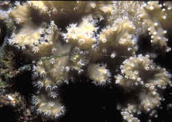 Colt Coral (formerly Cladiella and more recently Alcyonium. Now Klyxum) I have been searching for info on colt coral maybe you could help me. recently my colt stopped polyping out. I checked the water and all is very good. my Bullseye, clove polyps, mushrooms and hammer are all doing great although I did notice my button polyps a little withdrawn. I am worried the colt will eventually starve (it has been 3 weeks since it has fully polyped. Thanks for any help or info Rich <do try a change of carbon (small amounts used weekly instead of large portion monthly), a good water change of 25% or better, and be sure that your skimmer is giving you almost daily skimmate. You have listed some severely noxious corals that require these measures. If water quality hasn't been up to par, you might blame allelopathy from the chemical warfare of your corals. Anthony> Capnella "flopping" Dear Guys, Hope you had a great holiday season. I can't find anything on my situation in your archives. <appreciate you looking... abroad, this dilemma falls under the category of Nephtheids deflating with most attention drawn to the aposymbiotic cauliflower corals> I have a large Capnella that has been doing well. It has taken, however, to laying down on the substrate, often with different branches in different directions. I thought perhaps it was attempting to attach, <at best a reproductive strategy... more likely duress> but it frequently changes where the branches are. Sometimes it goes upright again. The polyps are open and otherwise it appears great. However, my clam does not appreciate being draped. Everything else is fine; parameters good. Is this a problem or not? Pam S. <likely a sign of stress... is there a very noxious coral nearby (within 6") like Colt coral, a Euphylliid (haller, octopus, torch, bubble), mushroom anemones or Starpolyp? Else, have you been weak on carbon use (not even monthly let alone weekly)... same neglect on water changes? I'm suspecting a noxious accumulation in the water from husbandry or allelopathy or both. Do send a picture if possible. Best regards Anthony> Human Poisoning from Sarcophyton? Anthony- After a somewhat panicked web search, I came across your article: http://www.reefkeeping.com/issues/2002-06/ac/feature/ on coral propagation in Reefkeeping magazine. I say "panicked" because while I was attempting to cut a diseased portion of a Sarcophyton species off, I inadvertently cut my finger in the process. The cut was shallow; so shallow that I did not realize I cut myself until the "operation" was complete, and it did NOT draw blood. However, I'm worried about any toxic reaction. It's been two hours as I write this, with no sign of rash or anything at the cut site, or any symptoms that can't be explained by panic disorder. Are there any warning signs/window of time I should be looking out for a "bad" reaction? Is it possible I introduced something harmful or lethal via this shallow cut? I feel incredibly stupid for (a) doing this and (b) e-mailing someone I don't know about it, but I'd really like the opinion of an authority on this so I can rest easy or get myself to the hospital. Thank you very much for your time.. -Todd <Cheers, Todd. Very glad to hear about the propagation efforts! Sorry to hear you got a scare :p No worries though my friend. Nothing imminent is likely regarding a poisoning or allergic reaction. What risk there is no worse than the same risk of being bit or stung by a non-venomous fish or even simply putting your hand in the tank on a daily basis with a hangnail or other non-related wound. Specifically, there are nasty microbes in all aquatic environments and specifically we fear Vibrio or Mycobacterium. Your first step of course was/should be to cleanse the wound thoroughly with soapy water and then use a disinfectant (antibiotic cream, peroxide, or the like). The doctor is unlikely to be necessary but do call at least to get his advice. Really... the concern here is more from a septic infection from the razor than anything the coral could impart. Sarcophytons are specifically noxious to other corals and aquatic invertebrates with regard for allelopathic compounds. Again, since this is not an overtly poisonous (to humans) animal and you didn't even draw blood... it seems likely that you will have a very nice holiday week. The only poisoning that I see as being likely in your near future is alcohol poisoning tomorrow night <G>. Happy New Year, my friend. Anthony> Coral ID Hello Jeff from reeds reef said ask you to help identify this coral if you can Thanks <not a tough one at all for us, bud. The coral in the image is a Sinularia species. Commonly imported from Fiji, Tonga and Indonesia in these bright green colors. Best regards, Anthony Calfo> Green Sinularia Hello Are these hardy or delicate do they need lots of light <unlike most Sinularia finger leathers which are very easy to keep... Green Sinularia are somewhat to very sensitive to handling and water quality (especially avoid high temperatures and touching the coral with bare hands... use gloves or only touch rock base). They may burn or change color under bright metal halides, although 20K Radium brand MH are very good for this species. Otherwise, 2 VHO blue and 2 VHO daylight bulbs would keep them very well. Their polyps are too small to be fed organismally... don't waster your time with DT's on this coral. Do consider reading Eric Borneman's "Aquarium Corals" book or my "Book of Coral Propagation" for more detail on this and many other corals. Best regards, Anthony Calfo> What Happened to my Toadstool Leathers I have 2 toadstool leathers. I bought them 3 weeks ago. They have been beautiful. They both were fully extended with long beautiful polyps within hours of placing them in my tank, and have remained that way ever since the first day. Until Monday. Monday I came home from work and they were not extended at all. No polyps and the corals kinda shriveled up like they do sometimes at night, but no