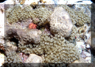 yellow/ish colonies over dead corals. Red Sea, open and closed