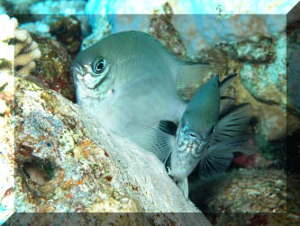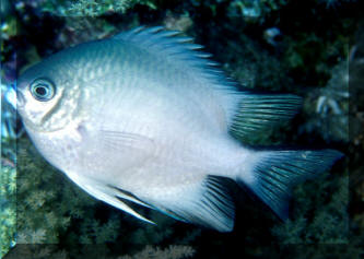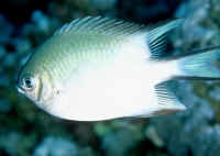 The other members of the genus not pictured are fabulous potential aquarium additions as well... on several counts. They're beautifully colored and marked, interesting behaviorally (out and about most all the time), hardy and undemanding environmentally. They are also broad in terms of food acceptance, easy to find in good numbers in countries that have good collection facilities… and unlike so many damsels, though relatively large (to about 4 inches), they're uncharacteristically (for the belligerent damselfish family) easygoing! Selection: As with other damselfish species, follow these generalities exist when picking out Amblyglyphidodon specimens. 1) Source: All three species are found in good numbers in Fiji, Indonesia and "the Kingdom" of Thailand. The best are from Fiji, with the possible exception of Amblyglyphidodon leucogaster, the Whitebelly Damsel, which sometimes is available in the west from the Red Sea. 2) Buy from systems with no dead or dying specimens. Look for signs of gill burn/ammonia poisoning from recent shipping; cut-marks on damsels from mis-handling and aggression, and avoid that tank. Beware of tanks of damsels with individuals hanging, drifting around having "private meetings". 3) Don't buy the smallest (<3/4 inch) or the largest individuals available. Small ones die easily and large ones don't adapt well to captive conditions. An ideal purchase size for this genus is between 1 ? to 2 inches. 4) If you're going to have more than one species/specimen, buy and place them all about the same size and time; this reduces inter- and intra-species aggression. 5) Buy stock that has been acclimated-stabilized. Damsels that have been adequately acclimated and held for just a day or two are extremely hardy. Just-new ones may die easily. If you can't be assured that your new damsel livestock have been "rested" by your supplier, do so yourself through quarantine. Environment: Amblyglyphidodon Damselfishes are easy to keep in aquaria. They are not fussy in terms of water chemistry and physics. Temperatures in the low 70's to low 80's F. (72-82) are ideal. Any amount of light, dim to bright, suits them. In terms of display, these Pomacentrids prefer a reef setting to a more sterile approach. Though they are sometimes found in close association in the wild territoriality can be prevented by under-crowding, stocking one or less per 10 gallons, and provision of plenty of cover. They like hiding spaces. Provide coral, shells, plants- some nooks and crannies for social-psychological shelter. Foods, Feeding: These damsels are mainly generalized zooplanktivores in the wild, secondarily consuming moderate amounts of filamentous algae. In captivity Amblyglyphidodon Damsels quickly learn to accept all foods readily. Frequent small feedings 2-3 times per day of a mix of foods sustains them well. Nutritional diseases are all but unknown in this genus. Infectious and Parasitic Disease: Damselfishes are parasitized internally and externally by several species of sporozoans, Cryptocaryon, Oodinium, roundworms, flukes tapeworms and crustaceans. The presence, abundance and susceptibility of these pathogens to varying salinities and treatments are complex. Damsels for the most part are disease resistant and if preventative measures have been executed and their environment is optimized you can expect low parasite loads. Most treatable conditions (external) can be excluded by the freshwater dip treatment and low specific gravity manipulation. Like other Damselfishes these species respond well to therapeutic copper treatments.