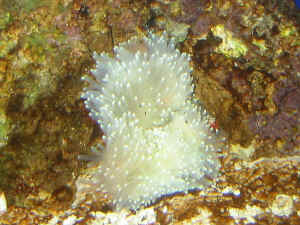 Anemone splitting? I can't see the foot or the tear due to the BTA being secured in a crack in the LR. However, it looks really good - certainly not like an animal that has a torn foot. As a matter of fact, it looks like it may have indeed split. I can't confirm it, but it looks like two separate animals and it sure has spread out over a large area. << Well that would be great. >> On the higher anemone section, I can see an edge almost all the way around. I can't see the back part, but there is definitely an edge between the 2 sections of anemones. I can't confirm separate mouths or feet yet either. << That is okay, just give it time. >> I'm attaching two pics. Am I being blinded by optimism? << Nope, it looks healthy and good to me. >> My female perc is fairly large (2+ inches) to give a perspective. I would have preferred my pair of clowns stay in the RTBA while the new BTA heals, but not much I can do at this point. At least they're just laying/swimming on it & not burrowing. It took them 2 months to go into the RBTA & all of 6 hours to go into this one - go figure. I'm thinking at this point the best thing to do is just observe - no treatment or changes. Would you suggest anything different? << That sounds good. >> Thanks, John << Blundell >> Rose Anemone Hello Crew, <Hi, MikeD here> I have a rose anemone that seems to be splitting. It has changed from looking normal and stretched into this long piece. How long does it take to split?<Although it's possible, this doesn't sound like splitting to me, but rather like an anemone that's gradually breaking down.> Also I have a clown fish that has Popeye. I think it is injury related and not a bacteria but possibly may be from the protein skimmers bubbles and aeration?<Again, possible, but unlikely> Is there anything I can do?<Here's a couple of suggestions. 1) check your lighting as many anemones require very good lighting, sometimes at least VHO's and always with bulbs that are regularly changed out as the wavelength drops rapidly after 6 months or so. 2) check your water parameters regularly as any ammonia or nitrate can be deadly and even chronic high nitrates can have an adverse effect. To be of any further help I'd need to know if it's a reef or FOWLR tank, what the size and fish load are, and of course, normal water parameters.> Thank you! Nancy Bulb-Tip Anemone Newbie Needs Help! 8/14/04 After much anticipating and preparation, I finally bought a bulb-tipped anemone. However, I am already becoming concerned. The anemone was purchased from our LFS about five days ago (special order). I picked it up as soon as the shipment came in, brought it home and acclimated it slowly over 3 hours. I added the anemone to our tank and our tomato clown took to it only a few minutes later (the clown had never looked happier). <this was your first mistake bud... all new livestock needs to be quarantined first... ideally for 4 weeks of disease free symptoms. With some notoriously weak shipping animals, like anemones, it is crucial to heed this advice. In this case, the clown can/will stress this weakened anemone who is not being given a chance to acclimate undisturbed (as with QT). Then there are the issues of introducing pests, predators and disease. Please read in our archives at wetwebmedia.com about the critical need for QT> Later, the anemone moved to a new location over night. For three days, the anemone looked big (6-8" across) and beautiful. It seemed very happy and healthy. Large bulbs had formed and I was extremely pleased. It deflated slightly at night, but not much (down to 5-6"), and inflated again during the day. I was having so much fun with my anemone that I fed it for the first time yesterday. It quickly took the piece of whole cockle (Tropical Marine Centre) from me. <I recommend that you never feed anything larger than finely minced meaty foods... else the anemone may (commonly) regurgitate the food at night and still starve to death in time> But today, I'm seeing a much different anemone. Though still attached to its original location, the anemone has deflated to almost nothing (1 1/2 - 2" across -the width of its stalk- with very stringy, short tentacles) and has retreated to its hole in my live rock. <many possibilities at this point> Our clown tries to enter the anemone, but doesn't have much luck. Nonetheless, it remains loyal and continues to return. <it is in fact a source of stress... perhaps significant... at this point. Neither anemone or clown need each other> The anemone has been in this condition for most of the day (I was unable to get a decent snapshot inside the hole). I panicked and quickly checked all my parameters. All normal and the same as when I added the anemone to the tank. Did a 5g water change anyway (figured it couldn't hurt). <yes... very wise> I've had the tank for about 5 or 6 months now and all other aquatic life are thriving. Is this normal? <hard to say diagnosing from remote> From what I've read, anemones deflate a little bit after eating. <rather more often inflates> I'm not an anemone expert, but this deflation looks like more than a little bit. It almost looks sick. I've also read that these anemones will start looking like this before reproducing. Is that possible only five days after acclimating to a new tank? <yes> Any other ideas? <always QT everything wet you bring home... without exception. Keep up with the water changes in the meantime and observe> Your help would be tremendously appreciated. Thank you! -Brad My tank: 36g with Wet/Dry (suitable for 125g) and Kent Nautilus TE skimmer 1 tomato clown 1 yellow tang 1 blue damsel 1 choco-chip star 10 hermits 5 turbo snails 35-40lbs live rock 130W compact fluorescent Temp=78F Specific Gravity=1.0238 pH=8.3 NO2,NO3,NH3=~0 CaCO3=400ppm <the chocolate chip star is categorically not reef safe and may harass this anemone and/or other desirable invertebrates in time. The hermit crabs to some extent too. Neither are truly "reef-safe". Anthony> Anemone to