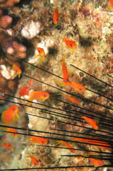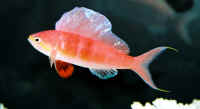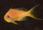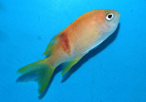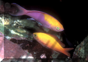 Behavior: Very interesting to watch. Active, quick to respond to any stimuli. Males challenge all apparent challengers, wrap themselves U-shape around females. Introduction/Acclimation Anthiines are very easily spooked on new introduction. Keep lights low and leave an outside light on for a good day or two. Keep your hands out of the system as much as possible and entirely at the onset. Watch other fishes for aggressive behavior toward your fancy bass. If practical, introduce them first. Predator/Prey Relations Fancy bass are a standard food item for almost all predatory reef organisms big enough to stalk and catch them. Larger piscivorous organisms will devour them like so many gum-drops. Reproduction, Sexual Differentiation: Amongst basses, the Tukas are notable for being sexually dichromic and dimorphic, having color and structural differences between males and females. The more mature individual males are larger, more colorful, and in many species sport a few elongate dorsal spines. (see photo) Feeding/Foods/Nutrition: Types, Frequency, Amount, Wastes Fancy sea basses feed aggressively on any fine meaty foods. In the wild, crustaceans, fish eggs and larvae. The more frequent and smaller the feedings, the better. Naturally this group is constantly on the prowl; mind that they do not get thin.