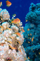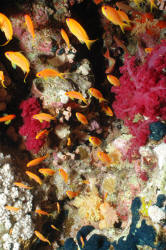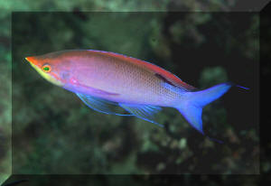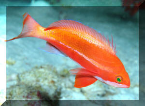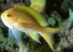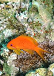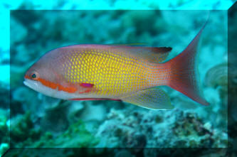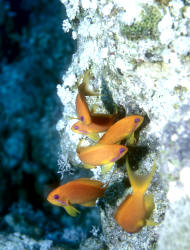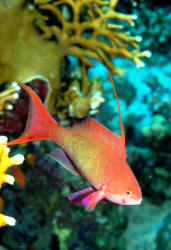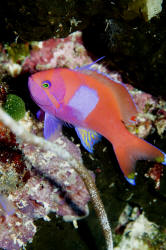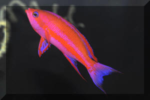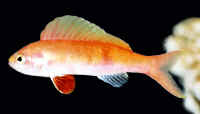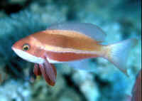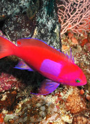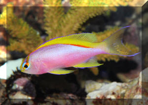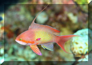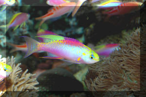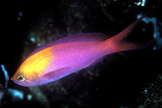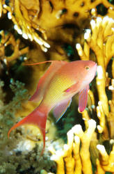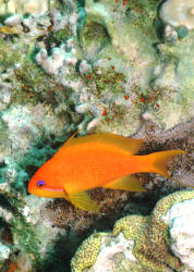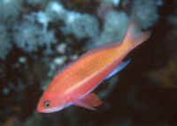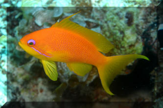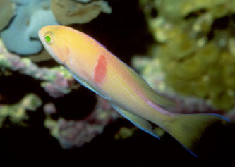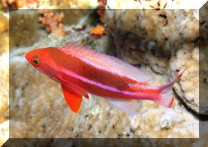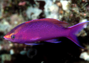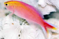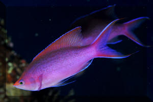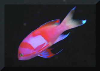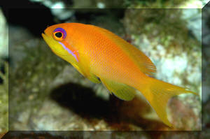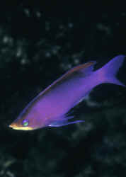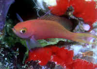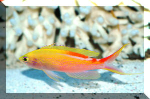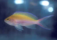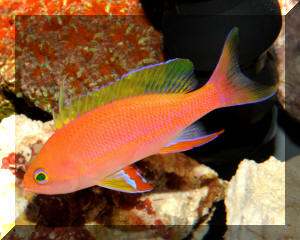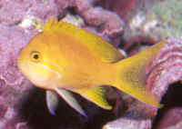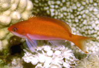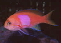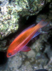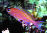Natural Range Tropical reefs in the Red Sea, Indian and Pacific. Shallows to a few hundred feet. Size: Three to six inches (7.5-15 cm.) total length. Selection: General to Specific Due to cost and variability of temperament within the group, the different species available should be investigated thoroughly before investing. Some individuals, populations, shipments, species are touted as being touchy, hardy, impossible... all are "challenging" to keep. I am in agreement with Michael (1991) in not suggesting the necessity of group purchase and husbandry. The various Anthiines live in large aggregations with a definite pecking order that is not replicable or desirable in captive care. If you want to buy a colorful male, only buy one. Similarly, unless you have a very large tank, more than one (or two) females is unnecessary and may well lead to endless fighting and loss. If you lose your only or alpha (dominant) male, the next most dominant specimen will in time change sex to take it's place. House only one species to a system. If at all possible, acquire all individuals at the same time from the same batch. I have seen all species offered in the trade maintained solitarily for extended periods of time. Solitude is not deadly to them. Amongst a group, choose the most outgoing individual(s). Leave skulkers behind. Avoid specimens that have a poor index of fitness (that are skinny); particularly one's that are thin behind the head. As always, confirm the specimen is feeding. Recent introductions will hide for days to weeks. Try coaxing them out with live foods and be patient.