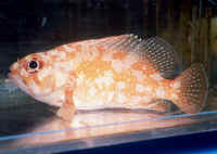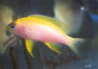 Disease: Infectious, Parasitic, Nutritional, Genetic, Social Unfortunately this group as a whole is very susceptible to bacterial and protozoan infections, which any amount of stress seems to trigger. My experiences with fancy basses differ from work by other authors; I've found they are sensitive to acute poisoning by the most common curatives; copper compounds, malachite and formalin. Prevention and the use of biological cleaners are emphasized. Losses from "social disease" are extremely common... With housing more than one specimen or crowding, the lowest fish on "the totem pole" are lost, with the next lowest sub-dominant individual next in line: Below are examples of a more dominant female and lower dominance one on the way out. Don't let this happen to you... Either purposely overcrowd the hardy species with just females, keep them singly, or just a few to as large a tank as possible.