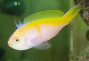 Male or Female Anthias? 5/22/07 Hi crew, I love your site and I thank you for your wonderful info. First off I have 2 beautiful Bartlett's Anthias. They have been doing great for the few weeks I've had them so far. I feed them a mixture of Sweetwater plankton, Mysis Shrimp and Emerald Entree. Approximately 4-5 times daily <Good to feed frequently, small amounts to this subfamily> and they love it!. Here comes my question. I was watching both of them and I realized that the bigger anthias (3 inches) has 2 short elongated dorsal fins. The smaller anthias (2 1/2 inches) has 1 long elongated dorsal fin. What are their genders? <Mmm... likely different... the smaller one here a male... this is posted on WWM: > http://72.14.253.104/search?q=cache:ixWFqarFsAUJ:www.wetwebmedia.com/anthifaq2.htm+sexing+bartlett%27s+anthias&hl=en&ct=clnk&cd=3&gl=us> I don't see any dominating fights or as a matter of fact no fighting at all. Could you guys please help me out on finding out their gender? -Peter <Read on Pedro, read on. Bob Fenner> Gender Change In Square-Spot Anthias - 02/23/07 Hello there, <<Howdy>> Love your website. <<Thank you>> It's proving as addictive as marine aquarium keeping (seeing that I am writing this at 1:30 pm. after reading today's FAQ's). <<Indeed>> I purchased a mature 90-gallon system six months ago and thus far, all is going well. <<Cool>> I am thoroughly enjoying this wonderful new hobby, and recently read The Conscientious Marine Aquarist, which I thought was great. <<Excellent>> I've looked through the information you have provided on the square <<spot>> Anthias (Pseudanthias pleurotaenia), but still have a question. <<A very neat fish>> I know that in a group of females, one will eventually become male, but is the reverse true? <<Not once the transformation is completed/final...in my experience>> My LFS sold me a pair of males (both have square blocks on their side), saying that one would eventually become male. <<I think you meant to say "female?">> Have I been misinformed? <<In my opinion...yes>> It's been four months now and one continues to show dominance behavior (charging, not nipping) toward the other, although at times they seem quite comfortable together. <<An illusion>> There have been no noticeable physical changes in the smaller, non-dominant one (or the larger one either). Both appear healthy, eat well, and have grown since I purchased them. <<My experiences in this area have been the subordinate male will eventually just "disappear" (die) from the stresses put upon it by the dominant male...even in a very large system>> Thanks for any advice you can offer. <<Wish it were more "upbeat">> Susan <<Regards, EricR>> Re: Gender Change In Square-Spot Anthias - 02/24/07 Thanks for your prompt reply and good advice. <<Quite welcome>> I will talk to my LFS, he's a reasonable man and I'm sure will be willing to take one of them back. <<Sounds great. EricR>> Susan Bartlett's Anthias, breeding 1/17/06 Hello all, First off thank you for your hard work and research. This webpage is a tremendous asset. Just a quick question for you; Is there a good book, article, etc. on the breeding habits of the Bartlett's Anthias? <Mmm... off to the library you go... I know naught re> I'd like to learn more in the hopes of some day successfully raising them. They are an absolutely essential part of my 180 reef tank. Simply a gorgeous fish. If there are no books available, where is the best diving location to observe them? Thanks again. John <Mmm, maybe... names like Ron Thresher (with plenty of interpretation/interpolation on your part...) Please read here: http://wetwebmedia.com/litsrchart.htm Bob Fenner> Re: Bartlett's Anthias, breeding 1/17/07 Wow, sweet. Here's my chance to write a hobby changing book. As soon as the roads clear I'm off to the library. Thanks for the quick reply. <You could likely contribute a great deal here... I have witnessed other Anthiines spawning in the wild... Mainly Pseudanthias squamipinnis (due to its being so common)... Captive-produced stocks of these little basses would make for a very nice addition to the trade/hobby... due to ready food acceptance, disease and shipping-stress resistance, ready adaptability to captive conditions... And these species do grow relatively quickly... a real plus for aquaculture. Bob Fenner> Lyretail Anthias...Females Turning to Males - 10/15/06 Thanks for the prompt reply before, EricR. <<Very welcome>> Today, I noticed some very aggressive behavior between two of the females. They were biting each other's mouth in a locked position and swirling around. <<Ah, yes...and so it begins>> I'm pretty sure this is a bad thing... <<Quite natural actually...determining dominance. The aggression will subside (though never completely go away) as the more aggressive individual establishes its dominance>> Could it be to determine the most dominant female? <<Ah yes! The more dominant individual will soon begin changing to a male>> Also, I was wondering if there were ever instances where an all female group, such as mine, has produced more than one male? <<<<Mmm, not likely...the dominate individual will see to that with enough aggression to keep the "urge to change" suppressed in the other females. The remaining females will also establish a pecking order of their own, with the most dominant female taking the male's place should it die. There will always be displays of aggression with this species, but aside from the "jaw-lock" you are witnessing now where the new male is being selected, most will be "more bark than bite">> Thanks! <<Regards, Eric Russell>> Sex change of single Square-Back Anthias Hello, <<Hello - Ted here>> Thank you for your help with other questions I have had. It has been a great help to ask the questions that I cannot find answers to after hours of searching, and get quick knowledgeable answers. We have a female Square-back Anthias in our 75 gallon FOWLR tank. It is about 3 1/2 inches now. This is the only Anthias we 