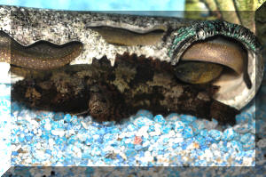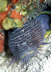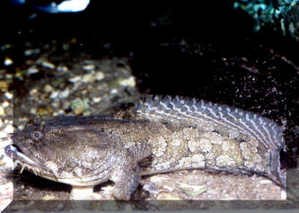 Behavior: Noise production. Called Toadfishes on a few counts. Their squatty profile, large mouths, capacious appetites, and "croaking" noise they make! Bibliography/Further Reading: Quinn, John R. 1975. The Toadfish (or stout-hearted defender of house and home). Marine Aquarist 6(2):75. |