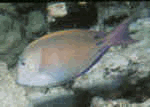 Naso unicornis (Forsskal 1775), the Bluespine Unicornfish; a deep-bodied species that develops a prominent rostral horn starting at about five inches in length. The body is light olive to gray with yellowish highlights on the abdomen, attaining a length of more than two feet in the wild.