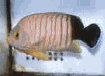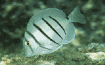Hawaiian reef scene: Juvenile A. triostegus Acanthurus triostegus (Linnaeus 1758), the Convict Tang or Manini (Hawaiian); is one of the best Acanthurus for use in reef tanks; noted for its size, easy going temperament, and habit of consuming fine, filamentous algae. Groups of A. triostegus make for an attractive display in larger reef systems. A good time to mention the Mimic Tangs, these Acanthurus species "pretend" in color, markings, and behavior to be other species. In this case, pretending to be Dwarf Angelfishes of the genus Centropyge; the specific advantage accrued is that of reduced predation as the Dwarf Angels are spiny and feisty, traits which may drive away would-be antagonists. The Acanthurus Mimic Tangs should be considered "good" aquarium species primarily due to their slow growth rates (can be kept as juveniles for years), their peaceful nature (to the point of over-shyness), and their readiness to eat prepared foods. Mimic Tangs thus make excellent reef tank inhabitants. Of note are the following Mimic Tangs of the genus Acanthurus: Acanthurus chronixis (Randall 1960), the Chronixis or Mimic Surgeonfish; very similar to Centropyge vrolikii, with an anterior which is two-thirds silver-gray, a deep black posterior, and identical blue highlights on its unpaired fins.