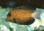 Ctenochaetus strigosus (Bennett 1828), the Yellow-eyed or Kole Tang; having a range encompassing the principal islands of Hawaii, from where it is most often collected, extending all the way westward to the east coast of Africa. The Kole ("coal-ay") is more a shallow water species found from the surface to depths of sixty feet or so. Ctenochaetus tominiensis (Randall 1955), the Tomini Bristletooth, is occasionally shipped from the Philippines. Of the four regularly available species of Ctenochaetus, the Tomini Bristletooth, is the most difficult to keep. There are a couple of other credible species of Ctenochaetus that we'll mention in passing for the sake of thoroughness, though they are rarely available to the aquarium trade: Ctenochaetus marginatus (Valenciennes 1835), this Indo-Pacific fish bears a strong resemblance to C. striatus but may be distinguished by its redder color and squarer caudal fin profile. C. cyanoguttatus is a junior synonym for this species. Ctenochaetus binotatus (Randall 1955), the Blue-eye or Two-spot Bristletooth, for the two dark areas at the rear of the dorsal and anal fin bases, is sometimes shipped from the Philippines. Of all the genera of Surgeonfishes, the seven species of Zebrasoma rank supreme with reef and general marine aquarists. The Zebrasoma Tangs are hardy, beautiful, and semi-peaceful, all. These disc-shaped Surgeons are the most adaptable of the family, readily accepting all sorts of aquarium foods and adjusting to the relatively small volumes of aquariums quite well. They are the highest rated in terms of disease resistance and treat-ability amongst all Surgeonfishes. In addition, these fishes thrive on filamentous algae: Zebrasoma desjardinii ("day-har-din-ee-eye"), Desjardin's Sailfin Tang; seeing this fish and Z. veliferum at the same time might cause you to do a double take, they are so very similar in color and markings. However, as a point of fact, Desjardin's Tang is currently an invalid species name (nomen nudum), and this Sailfin Tang is considered synonymous with Z. veliferum. We will list or mention it here as it will likely be encountered sold as Desjardin's in stores. This "variety" comes to the trade mainly from the Indian Ocean or Red Sea, so one way to distinguish it is by source locale, and still another is by its price. It also has a few less soft dorsal and anal fin rays (28,29D and 22-24A versus 29-33D and 23-26A for the Pacific Sailfin), if you can get yours to hold still while you make the count. Actually, the easiest discernible difference is in the markings on the tail. The Pacific is white, yellow and gray banded, and Desjardin's is dark with whitish yellow spots.