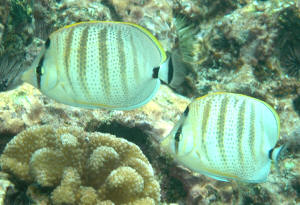 Punctato Butterfly erratic swimming... no useful info. 1/17/08 Newly introduced Punctato Butterfly seems to be swimming a little erratic. <-ally> He seems to be swimming much faster than the other fish and near the top of the tank. He swims normally at times but since he was a new introduction I am a bit concerned about this swimming pattern. <... no quarantine?> It does not seem to be motivated by aggression of the other tank inhabitants. <What are these?> Less than 24 hours could this just be adjustment to the new surroundings? <... in what size, make-up system?> Chemicals and PH level within normal ranges. Other tank inhabitants seem normal. Dianne Fields <Good for them. Data please. Bob Fenner> Lemon Butterfly only using one gill 10/13/05 Hello Bob. <You've got Josh this time.> I have a Lemon butterfly at home and I notice that only one gill is moving (the other one is completely closed). What does this mean? <It sounds like a gill parasite. Research here and elsewhere on this and be prepared to take action.> It starts to move again after a short period of time but is this a concern? <I would be concerned at this point. Is this a new fish? Do you have a QT? Form a plan and be at the ready.> Thanks <You're welcome - Josh> <<There was a recent posting of same behavior exhibited in an Emperor Angel, I believe Bob said they can do this "on purpose" (sort of like choosing to breath with only one lung). Do Google the site. Marina>> Urgent Chaetodontid Color/Marking Question Hi WWM, <Hello there> We are currently in the very final steps of producing the English version of a DVD, which is to appear on the market soon. During our research we found and used your site a lot and have found it incredibly helpful, detailed and - though we are divers - it has made us aware of and interested in aquariums. Well done! <Thank you> Narration for the DVD is to take place next week! All help appreciated! For more info, please visit http://www.DiscoverTheBlue.com <Will post, share> Our momentary question: Many Butterfly Fish have an 'eyespot' dorsally. We believe that we have understood the reason for this. -> Excerpt from our text: >>most attackers believe that their prey will flee in the direction into which its eye is pointing. When the hunter pounces the Butterfly Fish escapes - taking a quick route that the hungry predator did not consider!<< There are some, however that have a huge spot right on their REAL eye instead and lack the fake one. Example: Chaetodon semilarvatus. <Yes> Why would that be? Aren't they giving away their flight direction? <Another strategy... likely either to mask the eye altogether, or give the appearance of a much larger individual. Many fishes, invertebrates with focusable vision do mainly focus on the eyes of potential predators, prey... Have had Cleaner Shrimps climb onto and clean UW camera lens ports...> Kind regards. Hoping to hear from you! <Be chatting, Bob Fenner> Jacques Tarnero Klein Butterflyfish mating My two Klein's Butterflyfish appear to be trying to mate. Or at least it appears as if they are doing some sort of mating dance. Is this possible? Is it possible for them to mate in captivity? Are they livebearers or egg-bearers? Is there anything I should be doing in regard to this activity? <I don't believe you have to worry about that. Butterflies are sprayers, they really don't mate like freshwater angels etc, it's like a group thing, and they are egglayers. I do not recall anyone breeding butterflies in small closed system aquariums. James (Salty Dog)> Copperband Butterfly Behavior Hello, My newly acquired Copperband butterfly spends a large portion of his time swimming up and down with his nose against the glass on the left side of my aquarium. Otherwise he seems to be healthy. He looks good and spends some of the day grazing. He also eats pretty well. Me eats Mysis shrimp since he ran out of Aiptasia. Is he hungry? lonely? bored? itchy? Is there anything I can do to make him happier? Right now he's in my 55g reef, but I plan to move him to a 240g reef once its ready. Do you think that will help? <Well Justin, its not normal behavior for a fish to do that. As long as he is eating, you've won half the battle. Butterflies do appreciate very clean water. For starters (and in any marine system) do a 10% water change per month. You may want to try using some Chemi- pure in your filter. Something about this filter media that actually calms fish down. I've had a watchman goby for two months. Rarely ever saw it. After about a week with Chemi- pure he readily comes out at feeding time and noses around more so than he did before. May be a coincidence, but I have seen this trait before. James (Salty Dog)> Butterfly Sleep Wear? Nah- It's A Nocturnal Color Pattern! Hi Scott <Hi there!> It seems that the fish only has these white round markings on its body in the dark?.................does this make any sense. <Could be a nocturnal color pattern> When I got back home from work yesterday, my tank lights were on and the butterfly looked fine now circular white markings on either side of its body. This morning was a bit overcast and when I first opened my curtains I noticed that the butterfly has those white markings again.........But once more light got into the room the markings were gone again. Seems really strange have u heard of this kind of thing before. <Yep- sounds like a nocturnal color pattern. Common in many species> Also I got some new typo of hitchhiker with my new rock, can you believed my buddy was actually gonna throw this great rock straight out from the sea away......... <Yikes! Happens a lot, though> Don't have a pic, but it's a little round creature with a lot of ends that look like legs. <Sounds like an amphipod of some sort...Probably harmless..> Are there sites or anywhere on WetWebMedia where I could maybe identify this new guy, I also got quite a few hermits and some think like a snail but with large hardy shells. Thanks again, Ziad <Well, you could p