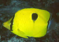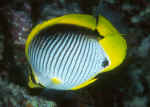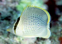 What would you do if you lived in a country of some 40,000 square miles of surface area, but only a few or so of which were land… spread out over about 2,000 small islands… a great deal of which is shallow tropical reef? Go diving? Me too! What and where is this pet-fish and divers paradise? The Maldives is a series of large atolls (sunken volcanoes in origin) in the Indian Ocean, running up and down latitudinally (80-510 miles) just southwest of the end of the subcontinent of India. Look close at that atlas and across the horizon… these are small islands, of about six feet elevation above sea level. Due to distance from major markets, there is not much marine ornamental collection in this region at present, and that's a great shame. The Maldivians have good, regular intercontinental air service, back haul little, have a tremendous sustainable resource in pet-fish livestock, and have a need for hard currency. With a population of some 290,000 citizens and not much land, tourism is the single largest source of national income (some 85 islands… and counting, are designated "Holiday Resorts"… and very worthwhile visiting). Perhaps as their government comes to recognize the enormous opportunities involving sharing their living world with others, concessions can be found for lowered cost of air-freight as exists in Fiji. Much of the fish, and non-vertebrate life found here that occurs in the wider Indo-Pacific is hardier and more colorful than when it occurs elsewhere. Additionally apart from species with Indo-Pacific ranges, there are some Indian Ocean-only organisms that are valuable in terms of beauty and survivability. Here are my notes and photographs on the thirty-two species of Butterflyfishes found in the Maldives, with the exception of a few deepwater forms. Classification Notes: The Butterflyfish family Chaetodontidae is a very important part of the marine aquarium world. Several species are 'stock' items (the Longnoses, Raccoon, Threadfin, genus Heniochus, among others) due to their overall beauty, adaptability, availability, and relative hardiness against disease. On the other hand, there are many varieties of chaetodonts that are near impossible to keep in captivity. The reasons for this poor historical survivability are several. Some species of Butterflyfishes are known to have restricted diets, many principally or only eating live coral polyps. Others just don't take the rigors of capture, handling and transport. Still others just don't seem to take to life in a small artificial environments. Captive Suitability Scoring: After long thought, investigation of others declared opinions, and handling of thousands of these species I've come to a set of "scores" for each species on its likelihood of surviving the rigors of aquarium care. To some degree this information is necessarily historical (what has happened, may not be the general trend to come), and is subject to "improvement" on the keepers' side as a consequence of providing larger, more stable quarters (like public aquariums do), and more diligent husbandry. But, by and large a relative score of one (1) indicates the "highest and best" survivability under captive conditions; let's say most of the specimens of this species collected surviving more than three months. A two score (2) is indicative of mortality of more than fifty percent between one and three months. Lastly, and sufficient for our purposes, a three (3) is the worst score, with more than 50% of the species perishing before a months time of capture. I entreat you to leave the latter group to the sea, or at least to study about their care ardently and provide the best possible circumstances for these animals. The Best Butterflyfishes From the Maldives (1's): Of the 'good' Butterflyfish species there are more than a dozen that can be gotten from the Maldives. These are the ones that given choosing specimens of good initial health, more than half historically live more than three months.
