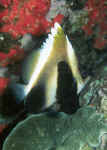 Heniochus genus Butterflyfishes are variously called Bannerfishes, Wimplefisch, Poor-Man's Moorish Idols for their long, trailing dorsal fins. These are great aquarium species, given you have room to accommodate them. Some species get quite large!