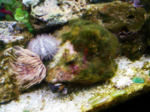 Desperately need advice on red slime algae -11/18/07 Hello, Thank you for considering my problem. In the past, this site has proven to be most helpful on a variety of topics. However, I am stumped and frustrated with a slime problem for which I cannot get adequate advice. I have consulted the FAQs of this site, among others, and my local fish store...all to no avail. I have a problem with a red slime that covers my glass, gravel, rocks, and even the bases of my polyps. It is not Cyanobacteria (it shows no response to antibacterial treatments), <This does not mean that it's not Cyano...> and so far my best guess is Dinoflagellates. <Dinoflagellates aren't red. They're more brown/goldish colored.> My system is a standard 29 gallon BioCube, with an extra pump and a Sapphire protein skimmer. My light is on for 8-9 hours a day. All of my levels are good...I have only two fish that I feed sparingly. Yet, no matter what I try, this insidious red scum keeps coming back. It clings to gravel and rocks, has a very slimy texture to it, extends tendrils, and resists everything that I've tried. Following the advice I have seen, I have purchased a protein skimmer (Sapphire...mostly worthless...produces light tea only), I have treated with Kalkwasser, I have added phosguard, I have tried letting it run its course (it covered everything), cleaning vigorously and regularly (no luck either), lowering/raising water temperatures, lowering/raising light duration....all to no avail. It has gone on for months now, without any improvement. <When you do water changes, do you vacuum it out? This helps.> This stuff is maddening. It has killed my snails, and contributed to the demise of some very nice corals. <hmmm... really?> I'm so disgusted that I'm about ready to just throw the whole tank in the dumpster and give up on salt water all together. <Yes, it can get frustrating (especially with small tanks). What is the extra pump? Strong water flow helps a lot. Adding another power head might not be a bad idea. Do you run any activated carbon? I know you said you've already done a lot of reading, but just in case you missed it: http://www.wetwebmedia.com/bluegralgae.htm> Please help! Frustrated Kyle <Sorry for your struggle, good luck. Sara> Attacking Cyanobacteria! 11/15/07 Hello there. <Hi there! Scott F. here today!> I hope you can help me and point me in the right direction. I have a 180 L sump set up and running through itself with a 2500 Ocean Runner as a return pump. I have a tank on order, but decided to set up my sump to mature the sand bed which is 17" wide by 9" long by 8" deep. I have an APF600 Deltec skimmer running, and I have added 2 small Clarkii Clownfish to add waste for the sand bed. <A very sexy way to make ammonia, if you ask me!> I have 6 Nassarius snails and 4 Cerith snails in the sand bed, which I thought would turn over the bed to stop the algae forming. <Snails will certainly turn over the sandbed, but they will not prevent the formation of algae...Denying the algae the nutrients and conditions that they need to flourish will do that.> The light is now on from 11am to 8pm, I have cut this down from 12hrs per day. The sump is an old fish tank with 2 x fluorescent lights - 1 blue & 1 daylight, these run the length of the 4ft tank. Hopefully this gives you enough information to work on....... Here is the problem, I have either red slime algae or red diatoms completely covering the sandbed and up the glass. The sandbed releases gas(?), which lifts the algae but does not break it. I have tried manually removing this ( I know this is fruitless ). <Sounds like Cyanobacteria tome...A common problem that can be rectified with some effort and time.> I have been advised to add a Conch - but will not be able to feed this once it has eaten the algae/diatoms and do not know enough about this animal to give it a good home. <That's an extremely conscientious attitude! Good for you! Besides, the Cyanobacteria are not readily grazed by herbivores.> I have read that turning the light of for 5 days will effectively eliminate this, but am unsure what else /problems this will cause. <It may kill the algae already present, but the root causes (nutrient excesses and environmental conditions) must be addressed to permanently eliminate this problem.> I feed the Clownfish twice a day. Could you possibly suggest any other way of managing this problem. My nitrate is under 5ppm my ph is 8.2. Hope this helps. Many thanks in advance for taking the time to help someone Algae issue's. Great Website. Neil, UK. <Well, Neil- there area few things that you can do to attack this problem. First, address the nutrient control and export issues affecting this system. You have a great protein skimmer...make sure that it's producing significant amounts of skimmate on a regular basis. Re-examine your feeding habits. Are you letting the packing juices from frozen foods get into your water while feeding? Those juices are filled with phosphates and other nutrients- and they are absolute "rocket fuel" for nuisance algae growth. Carefully thaw/rinse all frozen foods when feeding, and obey common sense feeding habits (no more than the fish can consume in a few minutes, etc.). How is the flow in this system. In most of the cases of Cyanobacteria that I've seen, flow deficiencies existed in the system...Move some water, man! Consider adding additional powerheads or incorporating other technology to increase water flow in the system. Check the alkalinity of your system-make sure that it's high and stable. Perform regular small water changes (like 5% o system capacity twice weekly, or 10% once a week) with high-quality source water (RO/DI, etc.). Be sure to make regular use of chemical filtration media (activated carbon, PolyFilter, etc.), and replace them regularly. Keep at these husbandry tweaks and you'll gradually see the algae problems begin to fade away. Steady as she goes- you'll get through it! Good luck! Regards, Scott F.> Cyano And A LF