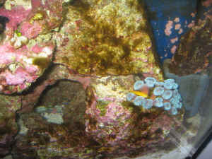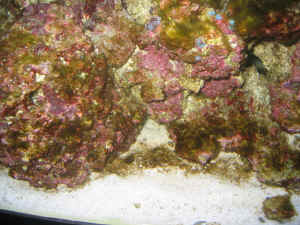 Genicanthus, sumps and slime algae - 3/22/04 Hello, I have a few questions for you, I have a 60 gal reef tank about 2 years old (40 gal Q tank) 2- 55W fluorescent 2- 55W actinic, Magnum 350 with carbon and a BioWheel on the return, CPR BakPak, powerhead (528 gph) with rotating arms, I have 3 clams, 2 anemones LTA, a brain (debatable), an elephant ear sponge, a colony of buttons, frogspawn, and a hammer 100 lb LR, we also have 2 cleaner shrimp and a lawnmower blenny and crabs and snails. <Wow, you can keep corals with that little light??> We have recently purchased a 4x65 (2 white 2 actinic) pc fixture and are awaiting delivery. <I would have personally went with all four bulbs at 10000K with no actinic but you config will be fine.> We would like to go to a sump but don't know where to begin, I am currently looking through your sump info. <The best place to begin. Develop questions then email them in> Our skimmer used to produce a good amount of waste but now has backed off a bit. <Need to clean the dickens out of it and be sure the cup is about 1/8 of an inch under the water line. Also as tanks age, they sometimes seem to go through changes as more waste is used by animal and processes.> Our water readings are: Am 0, Ni 0, Na 20 ppm (big concern?) <Nah> Ph 8.2, Cal 440, Alk around 3 and KH around 10 (or vice versa, problem switching these two) We feed BioPlankton about every other day, mysis and brine- occasionally to use it up. <Sounds like a good regime to me.> I also add Kent Marine Essential Elements approx every 2 weeks and directed on the bottle. Everyone is happy in the tank and growing. Unfortunately our ballast went out on the light & only two work and we are rotating between white and blue and the new one wont be here 'til Friday so we are hoping to get through that, if its not one thing it's another (second time in 3 months so new one was in order- Helios brand). <Cool. I hear ya though, reefkeeping can be a hassle sometimes> My question- finally- is this an acceptable system? <Sure. Why not? Two years is a new tank for sure. I would upgrade the light though. If you plan on any more light needing inverts like the clams> would a sump be a good idea? <If the fish load is high.> also we seem to have recently developed a problem with black and red slime algae I don't want to go throwing stuff in to get rid of it unless there is no other recourse, <Check out our site for more info on this> we did upgrade the powerhead from a PowerSweep 228 (approx 295 gph) to the stronger one (528 gph). <Good idea but be aware of dead areas in the tank. Powerheads have very laminate flow. Meaning a straight and narrow scope of water output> I read the following in regards to the slime algae and would like some more info "investigate and solve the root causes of this problem... Poor circulation, poor aeration, too much nutrient due to: Overfeeding, poor filtration, poor maintenance, lack of competing organisms for light, nutrients" <What's to say here? More water changes, less food, more water movement will most times solve the issue.> Also when feeding the BioPlankton should I turn off the skimmer for awhile? <Yes.> I have been investigating angels and reef and found that many places recommend the family Genicanthus as "reef safe" due to be planktivorous, what are your thoughts on this? <Genicanthus angelfishes in general are "Reef Safe"... best to start small (3" maximum), keep in large (hundreds of gallons), fully-established reef systems with plenty of healthy live rock, flourishing refugium for foodstuffs> I really appreciate your time and help so that we can make our tank the best we can within our means. <Thanks for being part of it all ~Paul> Thank you Melissa Recla What a Slimeball! >Hi >>Hello. >I did a 5 gallon water change on my 75 gallon tank and all was fine till the next day. I noticed a little slimy green dark algae. >>Ok. >This tank has been running for 8 months. Then today I noticed it's covered the entire bottom of the tank. >>The slimy algae? That would likely be Cyanobacteria, a result of excess nutrients. >I have a protein skimmer, an Emperor BioWheel, 2 power heads. >>This does NOT appear to be sufficient filtration for such a tank, but I can offer very little as I have very little information to go on. I can only hope the skimmer is working very well, and producing very thick, dark, nasty skimmate on a regular basis. >Can't figure why it grew because doing the water change usually reverse the cause of algae. >>Unless your make up water has nutrients present (nitrate, nitrite, phosphorous are the places to start looking). >My guess is there too much trace minerals being introduced from the new salt. >>I've never heard of Cyanobacteria or other true algal forms being caused by excess trace minerals (phosphorous being the exception off the top of my head). >How do I get rid of this unsightly algae? Thanks WWM crew >>You'd have to address your makeup water, testing before and after you mix the salt (with a QUALITY test kit). Then address your filtration in regards to your stock load and feeding. Those are the first, most obvious ways to start. Marina Red Growth on glass 2/12/03 Hi guys <cheers> Well after digging for hours through the FAQ, I can't find anything on this, so I'll ask: My 55g FOWLR tank has a strange substance appearing on it's back wall...it's a bright, pretty red "swath" almost like someone took a paintbrush and just slapped it on there - almost abstract even... From what I've seen of Cyano, it's NOT that - it's completely flat against the glass, it's texture would smear rather than "dust" off if you scraped it... It's not taking over the tank or anything and only appeared after I introduced live rock. Any idea what it is and do I need to get rid of it? (It's not unsightly in the least, kinda cool actually) if it's some form of macroalgae, then hurray, that was why I invested in LR. Thanks, Xeo <a BGA perhaps, but hard to say without a picture and better descripti