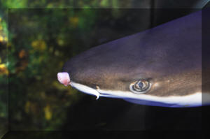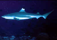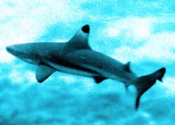Rockwork on the bottom and/or back is a plus, giving other likely tankmates places to hide/be. Do leave the upper area and a good part of the bottom open free and clear however as carcharhinids need room to move... for foraging, respiration and being themselves. A heavy, tight-fitting cover for their enclosures is needed as these sharks can launch themselves free of the water... and how. They will jump out given the opportunity. Behavior Territoriality: Reef Blacktip Sharks of different size can/will bite, eat one another if very hungry, but practically speaking, they can be placed together with relative impunity. Predator Prey Relations: On the reef, Carcharhinus melanopterus principally feeds on other fishes of many types (including triggerfishes, surgeonfishes, wrasses...), then in preponderance of diet, cephalopods (squid, octopus), crustaceans, and a large percentage of sea snakes in some parts in the wild. It is likely safe to state that any edible tankmate/portion of a captive system is game for their consumption. Collection These sharks are collected in a few "standard" ways and a few that are quite novel. There are accounts of a "shark hunting dog" (see bibliography below), the usual barbless baited hook... and an occasional "lucky catch" by tropical collectors using barrier nets et al. One such circumstance was related to me by a friend/collector, Eric Rood that occurred during his time in Hawai'i. A fence, barrier net had been placed and a group of tangs driven into it for hand-netting when a small Blacktip Reef Shark "hit the net" full speed coming from behind. Collecting divers are always on guard for removing ("pushing" them over the top, float line) such marauding non-prey as triggerfishes, parrotfishes... lest these non-invitees chew a hole through their barrier nets, making a way for the intended catch to escape, and ending the days fishing. Eric "dropped everything" and once he realized what it was, carefully grabbed the shark (by hand, as it is easy to damage these fishes with netting) and placed it in his holding container). A good catch, as these sharks fetch high collectors pay. In aquariums care must be taken not to "spook" captive sharks. What is called for are slow, deliberate motions, multiple nets/friends, damp towels to hold onto, and if necessary, lift the specimen/s from the water. Remember, carcharhinids are faster than you'll ever be. The tale about striking them on the nose (same family includes the "Great White", "Tiger"...) to avoid predation are myths. Foods/Feeding/Nutrition Regularly scheduled (same time, place, types of foods) of small fishes, squid (though messy, do clean, offer just the mantles) in an upper part of the tank (not by hand, use tongs) are advised. Daily amounts are best in my opinion, experience, for such small sharks. Some keepers, and all public aquariums that I'm aware of, insert vitamin supplements into these foods ahead of offering. Disease Prevention/Treatment Healthy Blacktip Reef Sharks tend to stay that way, or be dead with little notice. The species is susceptible to cryptocaryon if very stressed, exposed to a going hyperinfection, and a fluke (monogenetic trematode), Dermophthirius melanopteri, the causative organism for the white-patch syndrome mentioned under "selection". The latter is easily treated with organo-phosphates like Trichlor, Neguvon, masoten, dylox, DTHP... (all the same chemical). Conclusion: This common small carcharhinid is often seen in the wild, despite its popular use as a food fish. When on a dive adventure vacation, ask the local folks about the "little tan shark with black tipped fins". If it can be located in the area, they will know where to find it. Very small young "hang out" feeding and avoiding predators in the shallows in the morning and evening. Yes, I've seen this species kept in captivity, in public and private settings. It can be done, but the vast majority of trials result in short lived, traumatized owners and dead sharks. Try a more suitable species if so inclined to shark keeping. Bibliography/Further Reading: