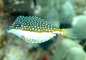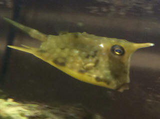 Ostracion Cubicus. Color, beh. f' 12/31/12 Cubicus Boxfish. Colour, fdg. 2/17/13 Hi Crew, I have looked on your site and cannot find anyone with a solution. I have a small, about 3cms Cubicus Boxfish <Wow! Small!> which I have had for about 6 weeks and all is well eating everything, New Life Spectrum and Spectrumax both 1mm sinking which I feed in small doses about 3 times per day. He has gone from being a bright yellow to a creamy colour but does get slightly more yellow when eating. <Interesting> I purchased Ocean Nutrition Spirulina flakes to try and get his colour back but still his it does not come back. The fish store said that Cubicus always lose their colour like the Regal Tang. I also have a Regal Tang (yellow belly) and he has kept his colour like the day he came out of the sea and doubled in size in the 7 months I have had him which I think is a good sign that the diet is complete in nutrients. Any magic remedies, the boxfish is not being stressed by any fish (I know they are prone to have their tail bitten by curious fish) I think he is very relaxed and happy and can only presume they lose their colour when happy and when he eats he gets excited and the yellow returns but only for a few min.s. Regards, Adam. <Just time going, by, your good care... Bob Fenner> Boxfish nutrition 9/25/09 Boxfish Troubles 2/16/07 Hello from Alabama, Thank you for all of the help your website has given me. I have recently purchased two boxfish (male and female, Ostracion meleagris) for a maintenance customer of mine. I tried to talk him out of it but it didn't work. The male is about 6" <Wow, big!> and the female is about 3.5". I got them from liveaquaria.com's "Diver's Den", so we could see what we were getting. <Nice feature, good company> They haven't eaten since I received them a week ago. The fish are very active but show no interest in food at all. I have tried fresh squid, shrimp, scallops, and even live freshwater ghost shrimp. <Wow...> The male does have a small white bump/pimple on his belly, not sure what this is. <Likely no big deal> If you think they may need some type of medication what would you recommend? <I would NOT treat, or even move these Ostraciids... they can/do go on "hunger strikes" particularly when moved... and won't starve for quite a long while if in initially good condition... I would keep trying... with an opened shellfish... when you call on this account> They are in a 65 gallon quarantine that shares a wet/dry with a 40 gallon quarantine that is holding a Rabbitfish. The customer has ordered a medium Naso tang and a small flasher wrasse that will also go into this quarantine system (in case this has any effect on medication types). Any help would be greatly appreciated. Thank you, Jeremy <>< <I encourage you to go ahead and place these fish... Will likely feed in the main/display tank... in time... versus possibly never feeding and perishing from "stress" in quarantine. Bob Fenner> What to feed my Puffer Hi again, Today I have a question about the puffer fish that I just recently purchased for my tank. At my LFS he was labeled as a Short Nosed Puffer, but in my research online I have found that it is sort of a subcategory of puffer fish, am I correct? <Do you mean... a Sharpnose puffer... as in the subfamily Canthigastrinae of the family Tetraodontidae?> Right now I have no way of getting a picture of it for you guys to help me identify it, but I'll describe it the best I can. It has the body shape of a Dog-Faced Puffer, but it is only about 2 inches in size. The LFS told me that he would only get to be about 4 to 5 inches long fully grown. <Uhh, "bad form" to buy ahead of investigating... the species... its requirements/needs... We have most all aquarium available species listed... Read here: http://wetwebmedia.com/fishindex3.htm. Scroll down to the Puffer articles, related FAQs...> He is a light gray in color with dark gray horizontal stripes, and his tail is all black. My question is, what should I feed him. They told me at the local fish store that he should eat 3 to 5 feeder guppies a day... <Negative... see the above where you should read> ...but I have read that freshwater fish are not very nutritious. I also have a Spotted Hawkfish that is on the same diet, but only 2 to 3 a day. I think it would be easier to feed them something frozen, but I'm not sure what they would accept. Would frozen krill be a good choice, or should I try frozen silversides? Or is there another option that I should go with? I originally was feeding the Hawkfish 1 ghost shrimp a day, but they got to be a little expensive. I haven't tried feeding the puffer the shrimp, but I have read that he needs something with a somewhat hard shell from time to time to wear down his teeth. Thanks for the help, Daniel <Study my friend... the mistakes you're making are easily avoided. Bob Fenner> Hawaiian Blue Spotted puffer not eating 9/25/05 Purchased a Hawaiian Blue Spotted puffer from an internet site over a week ago. Looked healthy on arrival and still looks well with no visible parasites but has not eaten a thing since arriving. I've tried flakes, krill, plankton, pellets all with and without garlic added. <Mmm, don't eat dried food/s... and generally don't eat after being shipped for a while> He is housed in a 50 gallon FO tank <Too small> with a small Picasso Trigger, Flame Angel, and Blue Tang. <Too crowded> No one has been bullying him or troubling him since he's arrived. <Psychologically... is very crowded> SG is 1.023, Ph is 8.2 and ammonia, nitrates, and nitrites are undetectable. I have a HOB power filter rated for 500 gallons per hour, an Aqua C Remora skimmer and 2 1200 Maxi Jets for added water circulation. Temp has been higher than I would like at 84 degrees and I've ordered a chiller last week that is yet to arrive. <... I'd cancel the chiller, put the money toward a reasonable sized system... at least double... better quadruple what you have> The other fish all appear well and are 