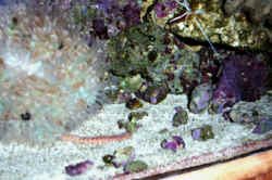 HUGE bristleworm Hi, I read that someone injected about 15 ml of white vinegar into the hole of a bristleworm to get it to come out so that he could catch it. Does the vinegar hurt the corals and other things in a reef tank? <Acetic acid/vinegar can be squirted in small quantities, won't hurt other life if not too much placed not too near...> Can the vinegar be injected into the worm if it is big enough? <I would not do this> I have one that is about a foot long and about a round as my little finger. We cannot catch it all. <Wow! I would trap or bait this animal out. Please read here: http://www.wetwebmedia.com/bristlewrmfaqs.htm and the related FAQs beyond to give you an idea of how to do this> What does the vinegar do to the worm? Does it just stun the worm and if so for about how long? Thanks, Renee <It would burn the worm... send it on a rampage. Better to trap or bait and net the animal out if you want to remove it. Bob Fenner> Mystery Worm? Hey Gang! Is this a Fire worm or Bristle worm? (see attachments) The creature is in the very center of (pic) Bristle worm1.jpg. From what I've gathered, this is not a threat, just a cool critter?) Scott <Well, Scott, it's kind of difficult to identify in the pic, but it does not look like a fireworm to me. I'd keep an eye on this creature to make sure that it is not harming the corals. Sorry I couldn't make a positive ID on this. Take care! Scott F> Bye-Bye Bristleworms Hi Guys, <Scott F. your guy today> Great web site! I've been reading over all your info and FAQs on live rock and have a question on unfriendlies like bristle worms. I'm planning on slowly introducing live rock to my very old established 55gal system. I have a number of fish in it including a hungry 3 inch Huma Huma trigger, a 5 inch moon wrasse and a couple 3 inch tangs. I'm going to take it slowly with live rock cured by my LFS and am taking all the typical precautions for ammonia. So how scary are those unfriendlies like bristle worms and aggressive shrimp? Should I be worried about them or will they just make a nice snack for my trigger and wrasse? <I wouldn't worry about them with this crew!> Also can you provide a good list of predators for the typical unfriendlies one might come across when introducing live rock? <I think you have a tank full of 'em already! No worries!> Thanks, Kris <Our pleasure, Kris! Good Luck!> Orange snouted Polychaete? Just found a polychaete in some live rubble I bought to see my refugium. It's small, 1 cm long and half as wide. It's got the usual bristles on it's sides, a brownish color, but none on its top. Segmented, and kind of an olive drab color. The body tapers towards the tail in sort of an elongated triangle. The odd thing is a orange "snout" on what I am guess is its head. I found a larger worm in the same rock earlier (it appeared to be the same as this little one) when I was doing a low salinity rinse, and it died from the water. The water was about 50*F and about 1.005 SG. This one survived and was crawling around in my refugium, so I sucked it out with my turkey baster. Should I keep this one or kill it? <Almost all worms are good scavengers. Unless there is specific information, like you found it eating something, I would keep them all. -Steven Pro> Mystery Worm ID Hello whomever gets this. <Scott F. here this morning!> Real quick ID question. Saw a small worm, lots of legs, what I saw was about 3 cm long, extremely thin, no wider than your typical pencil lead, and when it pulled back under the rock it had an orange tail, which was spread out much like the tail from a Lysmata sp. or something. The worm itself had legs on either side, on every segment, and was a black or dark color of some kind. Any ideas? Checked all over the net and posted a few messages and nothing so far. Thank you! <Well- sounds a lot like a bristle worm to me. Many different types exist. These worms are either harmful or helpful, depending on who you talk with! Some reef keepers feel that they can prey on corals and sessile inverts, others assert that they function like earthworms in a garden, and help to "work" the sand bed. If you don't want them in your tank, there are lots of ways to stop them, ranging from the use of crabs (like arrow crabs) to Pseudochromis, etc. To confirm that these are indeed a form of bristle worm, do a search on the wetwebmedia.com site for more information. Hope this helps. Good luck!> Bristleworms I have a 200 gallon reef with 300 lbs of liverock and the rock is covered with bristleworms. The little devils are everywhere. What is a good reef safe organism that will chow these little pests in a quick hurry? Or are they beneficial and should only be kept in check. Thanks for your help. <Please refer to our extensive coverage on www.WetWebMedia.com regarding. Some aspect of husbandry is off for these guys to proliferate so much. They have to be eating something. -Steven Pro> Bristleworms I keep reading that bristle worms are ok to keep, I had what appeared to be a bristleworm approximately 2 to 3 feet long in my reef. I still swear to this day it was eating my snails. Is this possible. <it is possible... they are opportunistic scavengers> Paul Cayen Koko worm rock and Porites Coral Hello Wet Web Crew! Hope all is well for you. As you by now know I am very new at this hobby. I'm not sure if the questions will ever end! <I should hope not... keep learning!> Recently I purchased a rock with about 15 Christmas tree worms from my LFS. The worms are growing on/in what I believe to be Porites coral. <agreed... AKA "Koko or Bisma worm rock". Porites (lobata) with fanworms incused> When I purchased the rock the coral was a reddish brown color but it's now rapidly changing to green. <if you still see the Porites polyps, it may simply be a color change. Please know that this symbiotic pair needs massive random turbulent water flow. That is key to success in keeping them both alive> The pet store told me it was some sort of sponge... do you believ