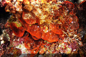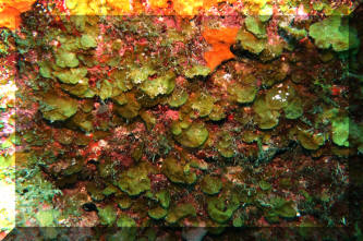Algae. Fan-shaped blades that encrust rock. Occur in brown, red,