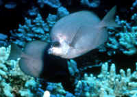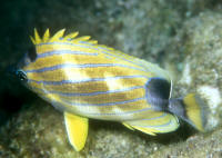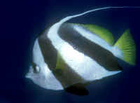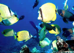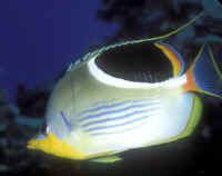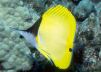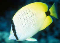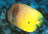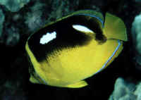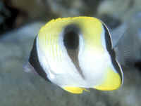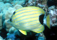 When asked at the most recent Marine Aquarium Conference at Southern California (I gave a pitch on the "ethics of marine collection" with Craig Hooker of the Fish & Wildlife Service and Steve Robinson, formerly of Cortez Marine, in 1995) what people can do in the trade and hobby to promote sustainable collection practices, many of the retailers and hobbyists there expressed frustration with the current state of affairs. Is it just a presumption that there is a higher percentage mortality of livestock originating from the Philippines and Indonesia? Whoever, whatever you believe re the validity of cyanide claims, cumulative effects of rough handling, long shipping time frames, other sources of loss of vitality, certain facts stand: The longer organisms stay 'in the bag' the more they die. Ready, inexpensive, efficacious assays for cyanide and other commonly used collection poisons do not exist. There seems no definitive end to the accusations of whose livestock are 'worse', what sources are to be avoided... There are suppliers who buy weekly from the Philippine Islands with almost no incidental losses. For instance Quality Marine of Los Angeles. I've been at their facilities at random times and experienced zero Dead On Arrivals in their P.I. shipments first hand. How do they do it? 1) They've been clear with their sources regarding what they want, will pay for. 2) Including instruction on how to pack their livestock properly; i.e. loose to allow the organisms to move, the bags to expand with lowered cabin pressure, with adequate water volume to dilute wastes during shipment. 3) In preparing the livestock to only send "A" specimens which they are willing to pay market price for... Holding them for an appropriate period of time to assess their likelihood of survival... Purging them (by not feeding) for a species & size-determined period of time prior to shipping. 4) Have ongoing provision (cargo container space reservation) with the airline carriers for weekly shipments, customs in the U.S. 5) Engage trained personnel with facilities for properly acclimating, handling and shipping livestock. By visiting, helping set up collecting/shipping stations around the tropical world, Quality Marine has been a pre-eminent player in the trade. Sad to say, all companies in the industry have not been able/willing to put their money where their hearts should be. But on with the topic of this article and the constructive advice I want to pass on to you. If you can't be at all sure as to the quality of livestock you're buying in any other way, pay close attention to its place of origin. Many of the organisms sold in the trade have wide geographic ranges. You don't have to buy fishes from the Philippines or Indonesia. Allow me to make this point in a different way; "Where do the best yellow tangs come from?" Answer: Hawaii. Why? On average they're larger, fuller, more yellow... and they live. What I'm getting at is the fact that livestock from U.S. controlled areas is a better ultimate buy than from apparently (initially) 'cheaper' sources. Guam, Florida, Hawaii, the U.S. Virgin Islands, California among others are tightly regulated requiring permits, inspection and operation of adequate facilities, and a full accounting of the disposition every single organism collected; yes, each individual. How can the end-user be sure they're not contributing to cyanide and other poisoning of the reefs? One definite way; buy American. In Hawaii and other states and 'protectorates' all drugs are prohibited for collection; and these laws are enforced. Not to leave them out, Australia, Singapore, Sri Lanka... also provide consistently good clean livestock. Thank-you for granting me the opportunity to make this overall statement. Now on with the practical exercise; a few of the species which you can utilize this choice, the Butterflyfishes of Hawaii. Classification Notes: The Butterflyfish family Chaetodontidae are a very important part of the marine aquarium world. Several species are 'stock' items (the Longnoses, Raccoon, Threadfin, Poor Mans Moorish Idols or Heniochus, among others) due to their overall adaptability, willingness to eat, and hardiness toward disease. Unfortunately, there are many varieties of chaetodonts that are offered in the trade that are nigh impossible to keep in captivity. Some are obligate corallivores, others just can't take the vagaries of captive handling and/or life in a small transparent box. Of the 'good' B/Fs (industry shorthand for the family of butterflies) we are blessed with having some of the best available from the aloha state, Hawaii. Natural Range: About a third of all the native animals and plants in Hawaii are endemic; that is, they're found only there. Hawaii has the amongst the world's highest percentage of unique flora and fauna. Of the twenty or so B/Fs from Hawaii three are endemic, the blue-stripe, lemon and multi-band are found nowhere else. You'll have to go to the source for these whereas the others may be bought from other places, but why? Butterflyfishes from Hawaii span the range for their family; four (e.g. corallicola) to twelve inches (e.g. ephippium) as adults. Their size belies their need for large spaces. Please see notes under habitat. The Best Butterflyfishes From Hawaii: (Hawaiian names in bold in parentheses)