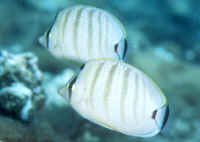 Chaetodon lunulatus Quoy & Gaimard, 1825, (kapuhili) and Chaetodon trifascialis Quoy & Gaimard, 1825, are the Melon and Chevron Butterflies. Besides being named by the same French shipmates in the early 19th century, these two are both impossible aquarium species, most refusing all food in captivity... except... live coral polyps! The Chevron is extremely rare from Hawai'i.
