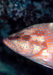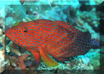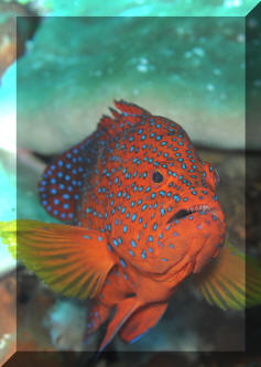 "Hoy, como esta mi pari jo"? It's our friends, Dennis Mok and Marty Beals, very large "family" of friends, cohorts at the Cebu Airport (a large island behind Negros in the Philippines). Thought I was being friendly, trying my few remembered words of Tagalog (I lived in the P.I. as a boy in the sixties). The folks who had been kind enough to pick us up and show us about kind of stared then one of them spoke with a smile. Oh, I see you know some Tagalog (the national language, out of many in this diverse multi-island country). "We speak Cebuano" (makes sense now, as this IS Cebu Island...). "A very different language". I assure you, he was/is correct. Luckily, as many Filipinos/as our hosts spoke very good English. We spent many happy moments touring around Lapu Lapu City with these "shell processors" (Marty and Dennis own/operate Tideline in Los Angeles), spending another week down south on Bohol Island diving, photographing. One memorable evening was spent at a very fresh seafood restaurant eating many delicacies, including this articles topic, the Hind (bass of the genus Cephalopholis), known as the Miniata Grouper. Another name (of many, as this is an exemplary food as well as pet-fish throughout its wide range) is the Lapu Lapu. Yep, same as the large town name on adjacent Mactan Island. Both commemorate a local hero who dispatched none other than Ferdinand Magellan in 1521 (just seems like yesterday). At any length, the fish, town, man and meal all of the same common appellation. As an ornamental aquatic the Miniata (or Lapu Lapu if you want), is a beautiful species of typical shy bass-like behavior (except when acclimated, at dinner time). Undemanding in terms of water conditions, accepting of most foodstuffs, and very disease resistant, a worthy recipient of the Lapu Lapu name. Range: Common in many parts of the tropical Indo-Pacific; Red Sea to Durban, South Africa over to west-central Pacific on most islands. Not Hawai'i or the Persian Gulf notably. Size: Most sold in the trade are a handful of inches. Attains twenty inches in the wild, about half that in captivity.
