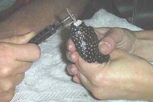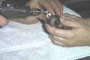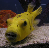 Correcting Overgrown Teeth… If you acquire a Puffer or another fish with overgrown teeth, or discover your pet has developed the affliction, you may need to take emergency action. Certain Pufferfish are more prone to developing overgrown teeth than others in captivity. Most notably, the Arothron species (AKA "Dogface" Puffers) are especially susceptible. Interestingly, the Diodon species seem to be less vulnerable to the affliction. It is interesting to note, in light of this, the very namesake of these two fishes' families. Arothron belongs to the family Tetraodontidae (4-teeth) while Diodon belongs to the family Diodontidae (2-teeth). Perhaps you can find a local veterinarian willing to help or advise on such procedures? Some aquarists have attempted manually filing the teeth down, but this is most always very traumatic on the fish. With the help of Greg Bishop DVM, Kelly first began doing puffer dentistry using MS 222 (tricaine methanesulfonate) and a "Dremel" rotary tool, much like the instruments that dentists use on people. Their procedure was conducted as follows: Make an anesthesia bath using MS-222 with enough aquarium water to obtain a concentration of 100 ppm. Note: to make this solution from a dry weight – 1 ppm equals 0.001 grams per liter. You can multiply the amount of bath water (in gallons) by 0.0038 [3.8 liters per gallon] to determine how many grams of MS-222 are needed here. Chemicals like MS-222 for aquatic husbandry may be obtained through your veterinarian or aquaculture supply companies like Argent Laboratories. Place the Puffer in the bath for about 20-60 seconds to be anesthetized, then remove the puffer promptly to begin the dentistry. Use a stone cutting wheel blade (composite formed or diamond-tipped, like for cutting ceramic tile) to trim off the tip of the overgrown teeth. Then use a gentle grinding bit to file smooth the rough or uneven edges. It may be necessary during the procedure to place the Puffer back into the MS-222 for additional durations of ten to thirty seconds if the fish begins to awaken, move, clench its jaws or bite you! You can trickle aquarium water on the gills (or through the towel cover) to make the surgery out of water a bit less stressful. The entire procedure should take less than a minute or two, though, with no harm to the fish. Another option for piscine anesthesia is clove oil (Eugenol Usp: 4-Allyl-2-methoxyphenol). Dose and duration for this method, like other forms of anesthesia, is somewhat variable by weight of the animal and sensitivities by species and individual. A typical recommended dose, however, is 4 drops of clove oil per liter of water (about 15 drops per gallon) to make an anesthetic bath. NEVER dose clove oil directly in the aquarium! It is an effective anesthetic with short exposure, but works as an agent of euthanasia to fishes in extended baths. In a clove oil bath solution, fishes should respond within one minute typically. Weak or smaller fishes may require a lower dose (2 drops of clove oil per liter of water) for an extended period of time (up to five minutes) for anesthetic effect. Large or tolerant fishes may require a slightly stronger concentration. We do not recommend more than 5 drops of clove oil per liter of water to make this anesthetic, but you can add 5 ml of ethanol per liter bath water for improved results. Clove oil can be easily found at online pharmacies, laboratory supply houses, local drug and health food stores - often by the aforementioned trade name, Eugenol. * Note: For small puffers, the use of a power tool may be awkward or too large. In such cases it may be acceptable to just use diagonal pliers (AKA "wire cutters") or cuticle clippers (Note: these are NOT the same as fingernail clippers… They are similar to miniature diagonal pliers) to snip off the tips of overgrown teeth quickly. Just avoid using such pliers on thick or large overgrown teeth.