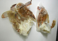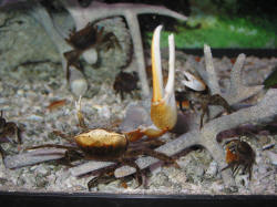Shell-on raw food shrimp are a good choice from the fresh seafood merchants. Live Crayfish or Uca fiddler crabs make a stimulating treats when available as well and are often available from local pet shops. Small Ghost Shrimp make particularly good fodder for juvenile and small-sized toothy fishes, and snails and hermit crabs are usually accepted too (check with local merchants for inexpensive sources of feeder snails). Beyond tooth wear and nutrition, these tougher prey items provide at least some needed exercise or challenge to fishes (behavioral enrichment) which are inevitably handicapped for activity in the confines of an aquarium.