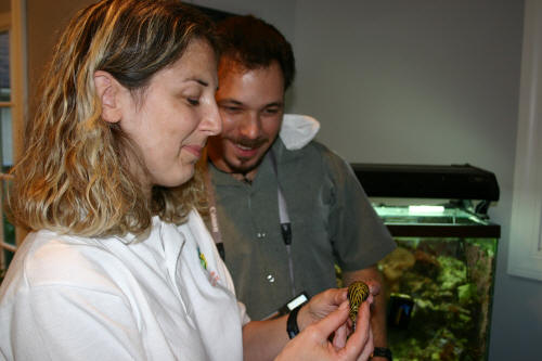 We strongly recommend having a second person on hand to help with the procedure. The need for assistance becomes quickly apparent for holding the specimen, prying apart the lips, using tools, and trickling water over the gills and body simultaneously at times. Whichever anesthetic you choose, be sure to have a fresh bath bucket of clean aquarium water ready immediately after the procedure to allow for the aquatic patient to wake up slowly and without the risk of display inhabitants attacking their vulnerability. Place the puffer into the recovery vessel with a supporting hand under its abdomen to guide it into the water. The fish will generally resume swimming on its own within 90 seconds. You may want to add a dose of water conditioner with colloids to reduce the stress of handling. You could also add healthy dose of vitamins to the water to supplement the stressed fish. Once alert and seemingly in full possession of its senses, return the fish back to the display, perhaps with the lights off for the rest of the day. Very soon afterwards, you will see the "patient" resume eating without difficulty and flashing a new "smile." While the fish dentistry is rather easy and effective, it would nonetheless be less stress on the keeper and the "patient" if such fishes were given a natural diet and habitat to reduce or eliminate the need for surgical action at all. Best fishes to you !