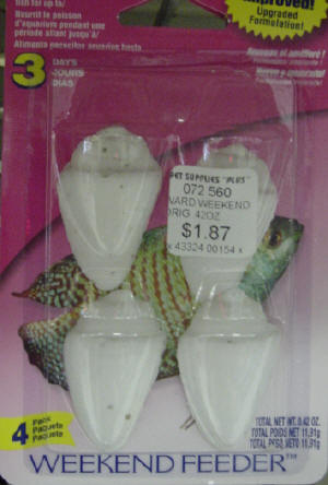 Before going away on vacation and entrusting the fish to the fate of these types of devices, I would strongly encourage the hobbyist to test the performance of the feeder beforehand. This will permit plenty of time to tweak the automatic feeder so that it gives the fish just the right amount of food - not too much or too little. About two weeks prior to leaving, try running the automatic feeder into a cup or some similar device so it is easy to monitor exactly how much food is being delivered at each feeding. This will also allow for time to make adjustments to the feeding dosage. After about a week of this kind of use, move the feeder over to the display and see how it functions there. There are several things to watch out for. Now that the feeder is actually feeding fish, does it appear that they are receiving enough food? Have they become accustomed to the feeder’s schedule and where the food is coming from? After months to years of being trained to come to the front of the tank when a person approaches the aquarium and lifts the hood, they now have to realize that food will be dispensed when no one is nearby at a set time. Also, check to make sure that the currents and filtration are not removing the food before the fish have a chance to eat. The Human Fish Feeder/House Sitter: If, instead of a mechanical feeder you have arranged for someone else to stop into the house to check on things and also feed the fish, I have a few words of warning and suggestions to keep the fish safe while the owners are out of town. First off, pre-measure all the food. Don’t give a novice fish keeper a big can of food and expect to come home to anything but a tank full of dead fish and a mass of rotting excess food at the bottom of the aquarium! I prefer to use the little containers that one can buy at the local drug store which are designed to hold daily doses of medication. . They have seven small, separate compartments and are marked for each day of the week. These are perfect for holding small amounts of dry fish food. If the fish also receive frozen food, purchase the frozen food that comes in little cubes (like small ice cube trays) and tell the house sitter exactly how many cubes of food per day. Alternatively, one could purchase a second pill container and placed portions of large slab frozen foods in each compartment. Last, hide the rest of the fish food! Don’t leave cans sitting around the tank. Inevitably, the part-time novice fish feeder will feel that the fish are not getting enough to eat and will feel some sort of compulsion to give them more. Help them resist this urge by removing and hiding the food reserves and force them to stick with the rationed portions. Automatic Feeders Grasslin Rondomatic 400: This unit has the nicest programming features of any automatic feeder that I have ever used. It also has individual compartments for each feeding so the aquarist can load each section with exactly the amount of food they want to have dumped. You can even alternate the foods so that the fish are fed a variety of dry foods instead of one standard offering. It also has another feature that I prefer. It is not battery operated. It plugs into a standard outlet. For all those pluses though, it has some drawbacks. The little compartments that this system utilizes are a pain to clean. Each one has to be individually removed, cleaned, and dried thoroughly every so often before being returned to the base unit to keep moisture and mold problems to a minimum. Also, all those great positive features that I prefer cost money. This is the most expensive unit discussed in this article at about $70-80. Nutrafin (Hagen) 2X: This is one of the least expensive units I have ever used (about $15-20) and it is a good example of the old adage that you get what you pay for. It is battery operated, which allows the unit to be conveniently located just about anywhere. However, it is also prone to run out of juice and go unnoticed when used continuously. It also does not have the most sensitive adjustment when it comes to the amount of food it dispenses. If the intention is to only use it for a relatively short vacation once in awhile then it is an ok choice because of how inexpensive it is. You can easily just drop in a fresh set of batteries for each trip to ensure the power is there for the entire time, while hopefully dialing it in close enough that the fish neither starve nor are overwhelmed with excessive amounts of food. But, if you are looking for something to take over the daily task of dry food feeding of a staple diet there are better choices. Nutrafin (Hagen) ProFeed: The ProFeed is an improvement over its 2X sibling. It has a nice programming feature plus an override button to test how much food the unit is dispensing. This added feature makes it a real plus in my mind. The downside is that added feature about doubles the price of this unit to around $35-40 over the 2X but in my opinion it is well worth it. Penn Plax Daily Double II: