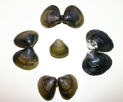 #3. Golden Clams are Hardy and Can Live Without any Special Care. This is half true. Golden Clams are very hardy. They can tolerate a wide range of environmental conditions, which I will expand on momentarily. This makes them very adaptable to aquarium life and also enables them to easily invade new ecosystems. The fact that they will live for months without doing anything special is also true. Unfortunately, Golden Clams suffer from the same situation that many other bivalves in aquaria suffer from, usually without the aquarist even realizing it. The condition is starvation, and it is difficult to notice because of the hard shell. Too often, bivalves do not get the right type or amount of food in captivity. This leads to slow starvation which happens in a similar way to most animals. The body uses up its own mass for energy. If this was say, a fish for example, you could notice that it was appearing to get skinny. Perhaps the bones would start to become visible through the skin, or the gut area would become sunken in, etc. Bivalves lose weight in a similar way, except for one key difference. You cannot notice it because the hard shell, which stays the same thickness does not reveal the fact that the inner tissue it withering away. There is no advanced warning. You simply find the clam one day with its shell gaping open having died. Clams do not have as high of a metabolic rate as fish do, and take a lot longer to starve to death. Aquarists should not take comfort in the fact the clams “live” for months without food. Some assume that the clam is "getting its food from the water" by eating bacteria and other plankton produced naturally in the aquarium. In reality, the tank is highly unlikely to produce the type and quantity of food needed by the clam. Without adding food specifically for the clam, it is simply taking a long time to die. If one assumes that the clam has a short lifespan, then this problem may go unrecognized. But learning that the clams may live up to seven years really puts the situation into perspective. There are other misconceptions about Golden Clams, but those covered above are the most troubling and frequently used in advertising the animals for sale within the hobby. We will continue on, though with the topic of feeding. Hopefully, by now it is clear that supplemental food must be added to sustain the clams. But what do they eat? Their major food source is phytoplankton, tiny free swimming single celled algae, and small protozoans. There are a few types of phytoplankton that are available to hobbyists now that are worth trying. Also, Spirulina and Chlorella, found at health food stores are also worth experimenting with. Additionally, aquarists can make “green water” cultures as a food source. The information on how to do this can be found in many other places on the internet, so I won’t go into it here. No matter what form of phytoplankton you use though, it is best to use a drip system. This will deliver the food in small amounts as a continuous supply. If you don’t use a drip system and add the food in batches at a time, just use enough to slightly cloud the water. Adding too much food can foul the water as well as clog up the filtering system of the clam. There will have to be some experimentation on the part of the aquarist to figure out the correct amount to feed. The best indicator of the clam receiving adequate quality and quantity of food is growth. Golden Clams have high growth rates compared to other freshwater bivalves. Starving clams will not grow at all. If you observe any growth over a period of say, one month then they are receiving adequate food. Another factor for growth is the presence of calcium and carbonate dissolved in the water. If you happen to live in areas that have “hard” water, you probably won’t have to do anything other than routine water changes to ensure that the clams get the minerals they need to build their shell and grow. If you have “soft” water, you will need to supplement with calcium and alkalinity boosters, both of which can be purchased at your local aquarium store. Another method is to use some calcareous substrate in the tank to achieve the same goal. It will slowly dissolve, releasing calcium and carbonate. Make sure that the other animals in the tank can tolerate a pH in the upper 7’s since the addition of these two substances can elevate the pH. If you have animals that require soft water with a low pH, it is best not to add clams to the system. The total of all the dissolved minerals in water is referred to as "salinity". Golden Clams are tolerant of a range of salinities, usually less than 13ppt, but may be able to be acclimated up to 24ppt. In nature, they are only infrequently found in brackish water though with most of them occurring in what would be considered fresh water. An additonal environmental factor which Golden Clams have a wide tolerance for is substrate type. Many other freshwater bivalves can be quite specific about the type of substrate they need to live in, requiring a certain size: sand, pebbles, stones, boulders, etc. Golden Clams, however, can live comfortably in just about any type of substrate. Their numbers seem to be reduced in areas that have superfine silt although they are more tolerant of silt than most other native fauna. The accumulation of silt, or siltation, is one the biggest environmental problems affecting freshwater systems. Altering the flow of waterways, damming, channelization, agricultural runoff, and other human activities results in silt that is capable of smothering entire waterways. Sadly, it is becoming more and more common to find little other than Golden Clams living in what used to be areas of high diversity including native bivalves. The preferred substrate of the Golden Clam is clay, fine sand, and coarse sand. Sand would make an ideal substrate for them in aquaria. But they can be found in almost any substrate, amongst boulders or even in cavi