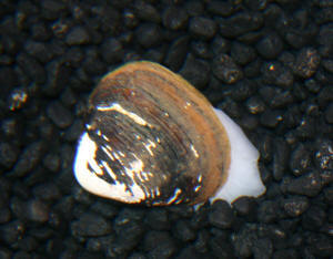 Meet The Species Corbicula fulminea (and possibly C. manilensis) can be found in many bodies of water through most of the United States, except for a few of the most northern states. They have been recorded as growing as large as 50-65mm, but it is uncommon to find them larger than 25mm (about the size of a U.S. half-dollar coin). Their color can change with age/size but is typically a golden yellow color, especially when small, then changes to a dark brown or black color as they grow. Different areas produce clams of different color, which may be due to genetics or environmental factors. As with many other bivalves, there is an organic layer that covers the shell and protects it from erosion or dissolution. This layer, called the periostracum, is what gives the otherwise white shell its color. As the clam ages, the periostracum can become worn, especially around the oldest part of the shell, thereby exposing the white calcium carbonate. The combinations of white, gold, brown, and black make this clam quite attractive. Corbicula are usually found in great abundance in areas that they occur, so catching many of them in a small amount of time is rather easy. Their attractive appearance and ease of collecting has led some enterprising individuals to begin marketing them to aquarium keepers. Previously, there were only a small number of people involved in keeping them. They would go to their local stream or lake and pick up a few to put into their tanks at home. Recently however, with the advent of the internet, the Golden Clam has begun appearing in online auctions, jobbers’ web pages, online aquarium outlets, and local aquarium stores. Due to simple misunderstanding- or the quest for the almighty dollar- the marketing involved with these little -known clams is often exaggerated or completely misleading. Let’s examine some of these claims and see if we can make some sense of them. #1. Golden Clams: "The Ultimate Bio-Filters". This is true if you are referring to “bio-filter” in the broadest sense. Clams are bio-filters, or “living filters”, in that they are alive and they do filter the water. The difficulty comes with the definition that “bio-filter” has come to represent in the aquarium industry. In actuality you could properly describe anything that is alive and filters water either mechanically, like bivalves, sponges, tunicates, fan worms, bryozoans, etc. or chemically, like bacteria or algae, as a bio-filter. Unfortunately, the aquarium genre has put so much emphasis on the bacterial (nitrification) aspect of “biological filter” that nitrification (the process of oxidizing ammonia to nitrite and then nitrate) and biological filtration have become synonymous. I am afraid that referring to anything aquarium-related as a "biological filter" will give the impression that this animal will "process" ammonia and nitrite. In the least it will cause confusion, especially with beginning hobbyists. Some websites imply this function by Golden Clams, while others are explicit. One claims that “there is no need for expensive filters” if you have Golden Clams. I must make it clear that simply having a bunch of Golden Clams in your tank does not mean that you can get by without an undergravel filter, trickle filter, or some other type of filter that uses nitrifying bacteria (or live plants). In actuality, these clams will add ammonia to the tank. I’ll explain this further below. #2. Golden Clams Reduce Nitrate. This one is simply not true, no matter what angle you would like to look at it. Assuming that this is a misunderstanding and not just a lie for marketing’s sake, the only way I can imagine that this confusion originated is from comparing them to Tridacnid clams. The popular Tridacnid clams, or Giant Clams, do remove nitrate from the water. This is becuase of the presence of symbiotic algae in their tissue. It is actually the algae that utilize the nitrate, not the clam itself. Even so, Tridacnid clams have developed a reputation for being "nitrate reducers" and are sometimes even recommended for this purpose. Golden Clams though do not have symbiotic algae and therefore do not remove nitrate. In fact, they help to create nitrate. Similar to many aquatic animals, when they digest proteins the waste product that is generated is ammonia. This is then converted to nitrite and then to nitrate by the biological filter – oops, I’ll be specific: the nitrifying bacteria. So Golden Clams can be considered as part of the bioload on a system, adding ammonia, and therefore nitrate to an aquarium.