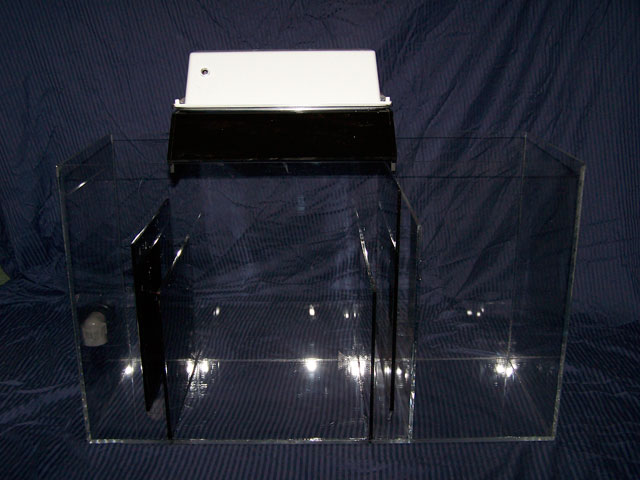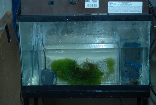 The finished product about to be installed to the tank. You can see the Deep Sand Bed in the background as well as the algae filtration in the foreground. To keep the Chaetomorpha tumbling, an auxiliary pump has been provided, as well as a fluorescent light. The last chamber allows for the return of the water to the tank, just as in a standard sump.