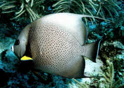 "Saviors are rarely recognized in their hometown"; a misquote in number, but true nonetheless. Such is the case with appreciation of the two tough, disc-shaped, black, gray and yellow angelfishes of the eastern Atlantic. By simple fate of being from the common Caribbean, these Pomacanthus are snubbed for more exotic choices in large marine angels. Is this a matter of over-familiarity breeding a degree of contempt? Don't get me wrong; there are gorgeous Indo-Pacific, Red Sea, and eastern-Pacific species, among other locations, but what's wrong with the gray and French angels? Nothing. They're disease resistant, ready feeders on all foodstuffs, transport well... good looking, not overly expensive. Here's my "plug" for considering these stalwarts, with notes on selection and care. Classification: Due to their close taxonomic affinities, the French and gray are termed "sibling species"; telling them apart can indeed be trying (I had them mixed up in my slide files). Both are in the genus Pomacanthus in the saltwater angelfish family Pomacanthidae. As young to sub-adults, the French can be discerned by its more rounded, golden emarginated tail fin. That of the gray is more truncate (squared off), and far less colorful; almost translucent. When adult the French retains yellow flecking behind its body scales, compared with the more somber dark overall color of the gray. One other ready defining characteristic throughout age/size is that the gray bears bright yellow behind its pectoral fins (look closely); the French is blackish on the under side. Distribution: The French and gray overlap over much of the same area; tropical western Atlantic, broadly from the Bahamas southward to Brazil. The French is also found in off West Africa. Size: These angels get big; a good foot and a half in the wild. Happily they can be slow growers in aquariums... take care to keep them fed, but not continuously over so. Selection: Both species are hardy and long-lived; the French runs quite a bit more money, but this is just a reflection of market pressure; its beauty as an adult commands a higher price. 1) Size: Though some folks tout buying and raising large marine angels from tiny beginnings, and public and private ventures have moderate success in adapting larger individuals to huge (thousands of gallons) systems, juveniles of three to four inch total length are best for most aquarists. This is the size range of greatest ease in transport and behavioral adaptation. 2) Time At The Dealers: This can be a very important selection criterion. Many, if not most "problems" that are going to manifest themselves will do so within two weeks of arrival from capture and transport. Waiting out this fourteen days obviates problems of too-heavy parasite loads, collateral damage and stress from collecting, and the specter of possible anesthetic loss. The last is an issue as these fishes are still caught at times with drugs; with debated after-effects. At any length, allowing time to go by "hardens" the new individuals and sorts the strong from the doomed. 3) Breathing: How frequent, deep and labored does the fish's gill movements seem to be? Here's where close observation and the help of an experienced friend can really pay off. Too fast, slow, excessive or non-closing movements of the gill covers spell trouble. Possible physical, chemical trauma, internal damage, parasites... A healthy specimen will be "cruising" its habitat, even if it's only a small cubicle, checking it and you out; not breathing laboriously in a corner spaced out. 4) Feeding: These angels tend to get their mouths and opercular spines hung on nets, and otherwise thrashed in the processes of capture, transport and holding. For sure you want to check for tearing and lesions on the mouth and body; but the chief yes/no question is "is the fish eating?" If not, let it be. Environment: These marine angels are quite tolerant as marine species go. In the ancient days of the saltwater hobby they were even used to institute nutrient cycling in place of the "standard" damsels. They will do well under a broad range of physical and chemical conditions. Temperatures in the low to upper seventy degrees Fahrenheit are within their natural range. They have a wide span of tolerance in salinity; the lower range of specific gravities, 1.018-1.021 is suggested. Habitat: French angels are best kept one to a tank. If they are to be mixed with angels of other genera, it is best to introduce them to as large a system as possible (fifty gallons plus) at the same time. Often, a new slightly larger individual may be added in an established angel system. Moving some of the habitat around and feeding at the time, and keeping a sharp eye are recommended. Pay careful attention to mixed angels within this genus, as one will grow more quickly and eventually do harm to it's fellows in all but the largest of systems. Introduction: Large intelligent fish species as Pomacanthus should routinely quarantined, in addition to what has been done before your acquisition. By carefully observing the specimen over several days time you will have reduced the probability of introducing an infectious agent, stabilized the animal, and further conditioned it to aquarium conditions. At the very least (out of absolute necessity of emergency, or in handling many transient specimens as in transshipment), these angels should be freshwater dipped with or without the added use of chemical adjuvants. Behavior: Predator/Prey Relations: These angels leave everything not edible alone, and are ignored by all but the biggest, most aggressive predators. On that note, though I've seen tiny (1-2") Pomacanthus in reef systems, I don't advocate them for anything other than "fish-only" set-ups. Large marine angels pick at everything in their reach; corals, anemones, shellfish, algae... Territorial Compatibility: As stated above, Pomacanthus angels are fine with most all other fishes... generally with the exception of other larg